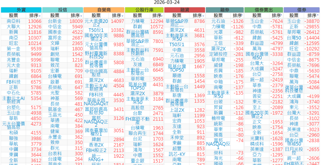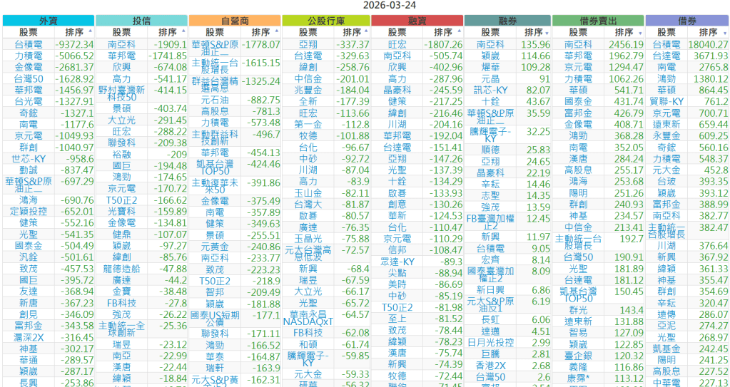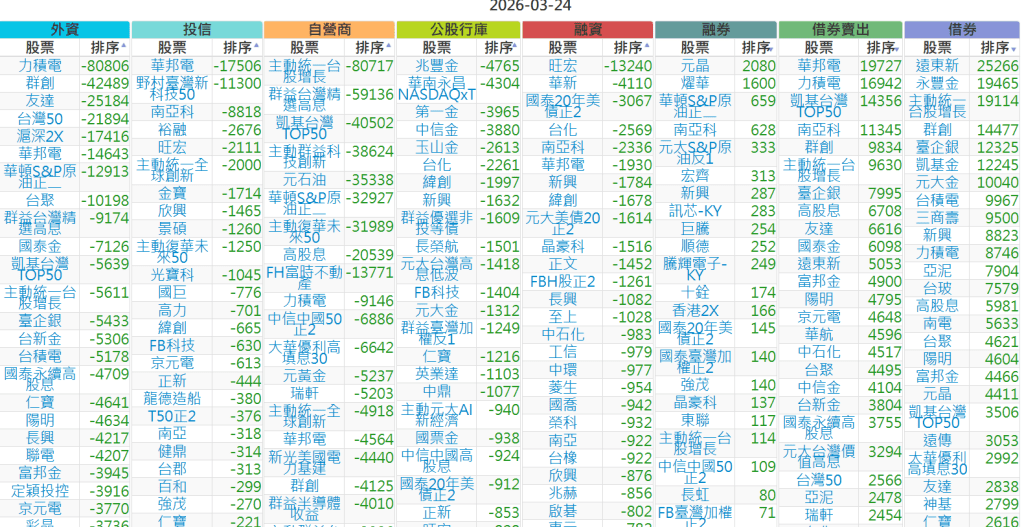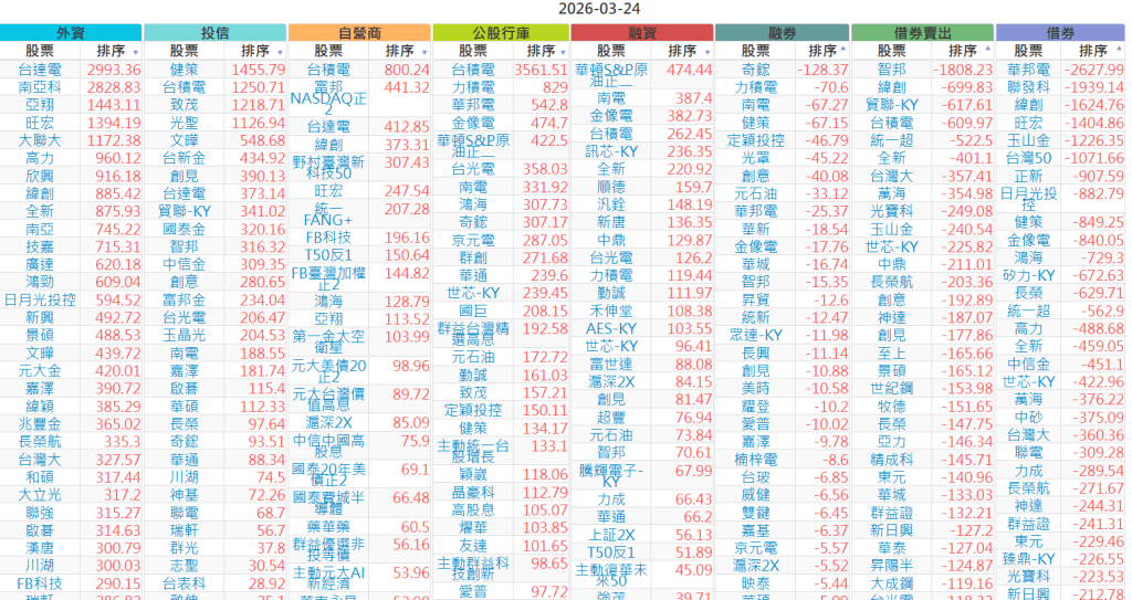 2026-0324【外資、投信】買賣超個股 2026-03-24 股狗網小編 投資誌-大盤 發表留言 上市:【外資、投信】買超(依金額) (單位:百萬) 上市:【外資、投信】賣超(依金額) (單位:百萬) 上市:【外資、投信】買超(依張數) (單位:張數) 上市:【外資、投信】賣超(依張數) (單位:張數) 免責宣言 本網站文章所提供資訊僅供參考,並無任何推介買賣之意,投資人應自行承擔交易風險。 分享此文: 分享到 X(在新視窗中開啟) X 分享到 Facebook(在新視窗中開啟) Facebook 喜歡 正在載入...