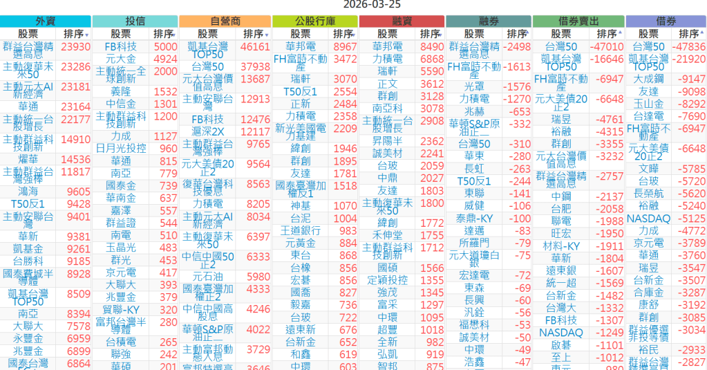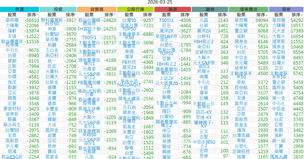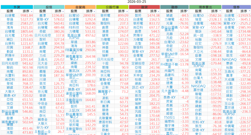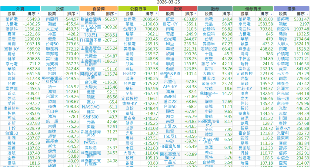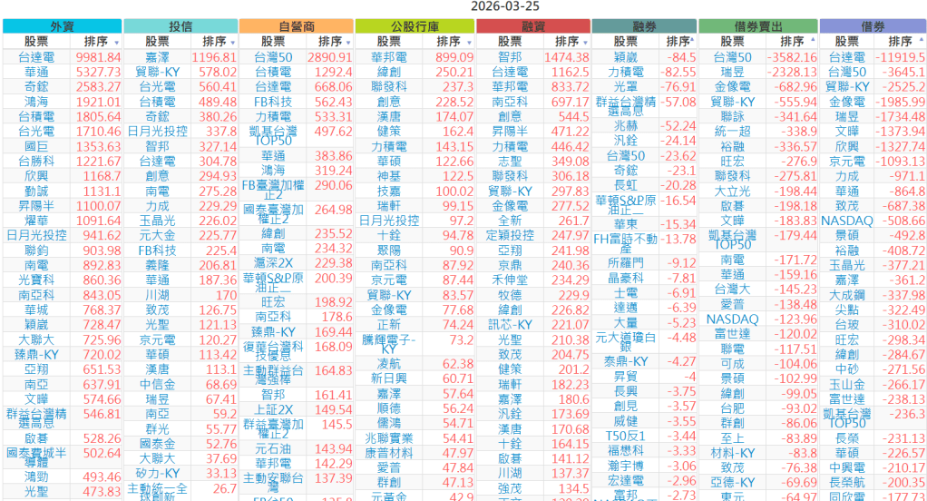 2026-0325【外資、投信】買賣超個股 2026-03-25 股狗網小編 投資誌-大盤 發表留言 上市:【外資、投信】買超(依金額) (單位:百萬) 上市:【外資、投信】賣超(依金額) (單位:百萬) 上市:【外資、投信】買超(依張數) (單位:張數) 上市:【外資、投信】賣超(依張數) (單位:張數) 免責宣言 本網站文章所提供資訊僅供參考,並無任何推介買賣之意,投資人應自行承擔交易風險。 分享此文: 分享到 X(在新視窗中開啟) X 分享到 Facebook(在新視窗中開啟) Facebook 喜歡 正在載入...