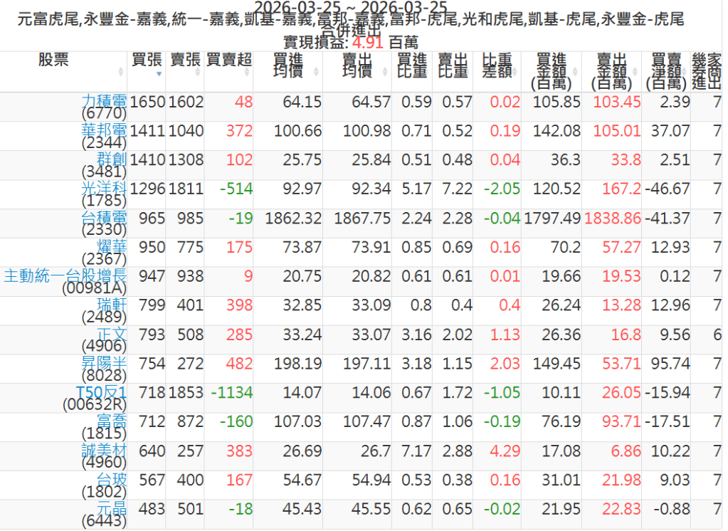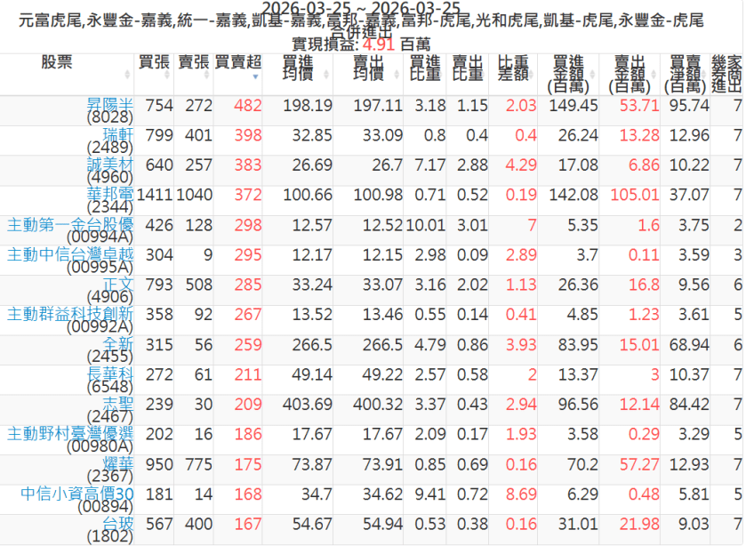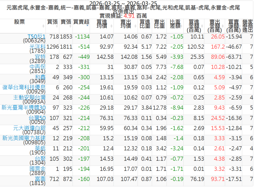 2026-0325主力買賣超個股 2026-03-25 股狗網小編 籌碼面每日資訊 發表留言 可參考下文 『如何查詢當沖、隔日沖分公司券商買賣』 主力當沖券商: 『元富虎尾』,『永豐金嘉義』,『統一嘉義』,『凱基嘉義』,『富邦嘉義』,『富邦虎尾』,『光和虎尾』,『凱基虎尾』,『永豐金虎尾』。 『當沖標的』 『買超股票』 『賣超股票』 免責宣言 本網站文章所提供資訊僅供參考,並無任何推介買賣之意,投資人應自行承擔交易風險。 分享此文: 分享到 X(在新視窗中開啟) X 分享到 Facebook(在新視窗中開啟) Facebook 喜歡 正在載入...