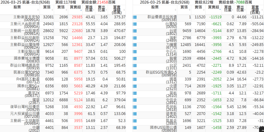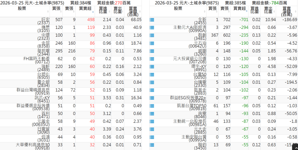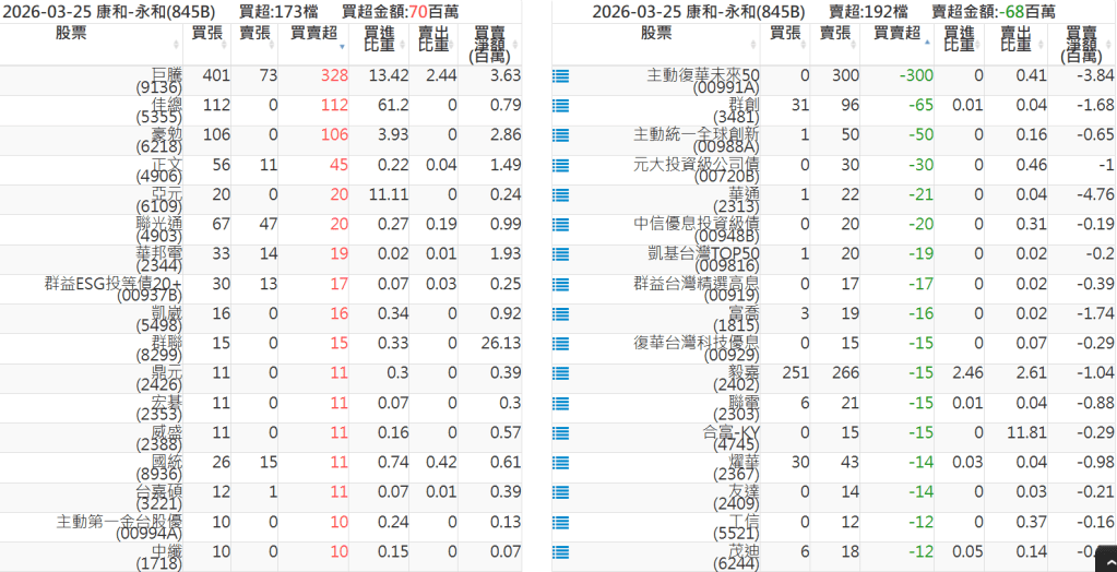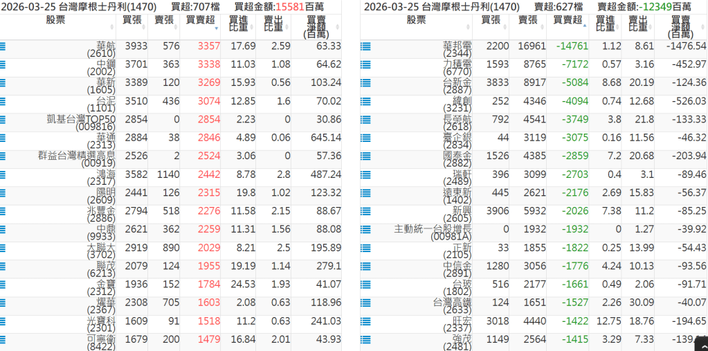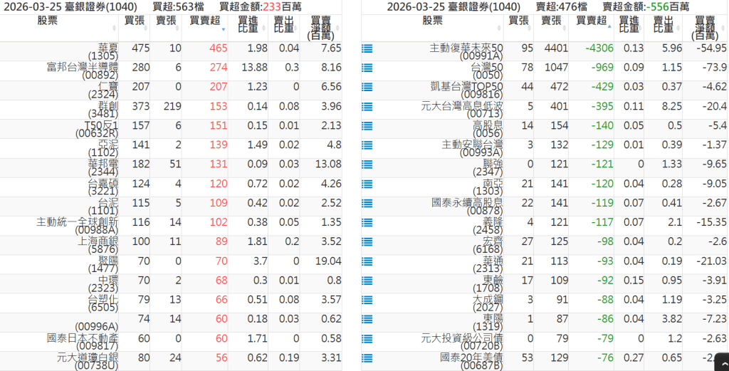 2026-0325關鍵券商買賣超 2026-03-25 股狗網小編 籌碼面每日資訊 發表留言 關鍵券商買賣超: 臺銀證券(1040): 台灣摩根士丹利(1470): 凱基台北(9268): 凱基信義(9216): 元大土城永寧(9875): 康和永和(845B) : 富邦建國(9658): 免責宣言 本網站文章所提供資訊僅供參考,並無任何推介買賣之意,投資人應自行承擔交易風險。 分享此文: 分享到 X(在新視窗中開啟) X 分享到 Facebook(在新視窗中開啟) Facebook 喜歡 正在載入...