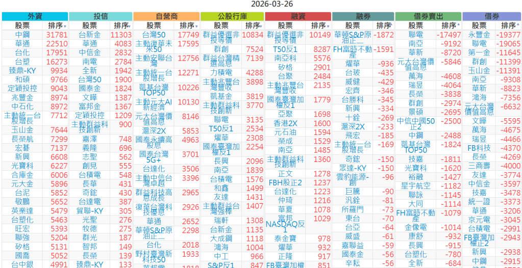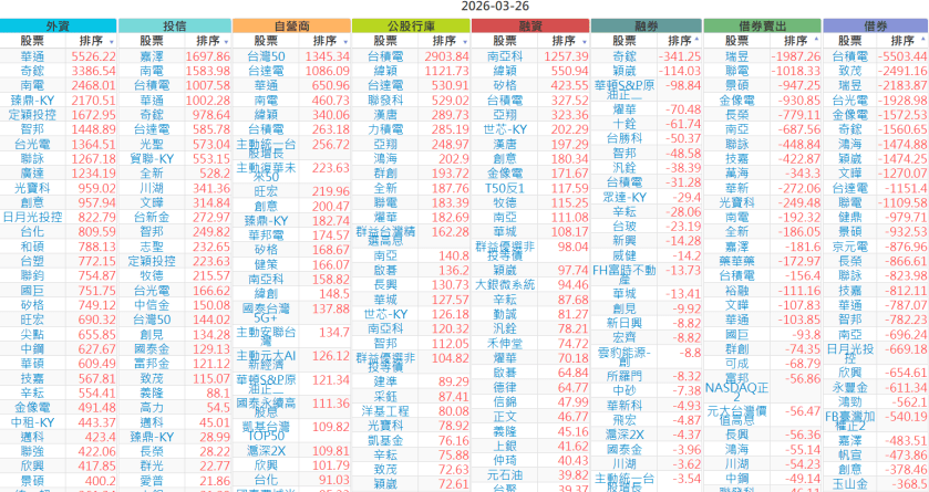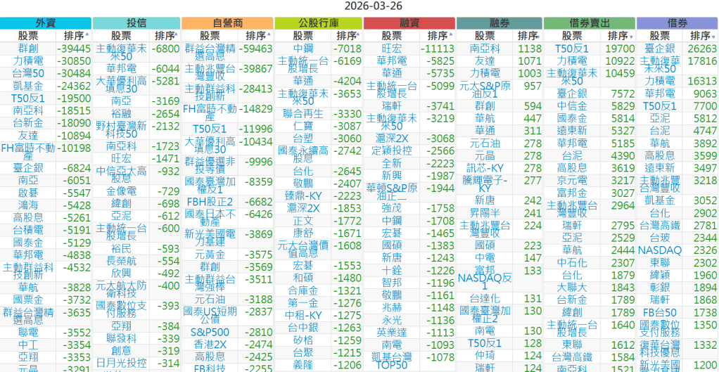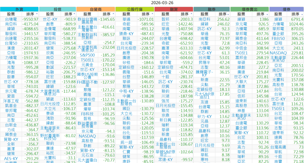 2026-0326【外資、投信】買賣超個股 2026-03-26 股狗網小編 投資誌-大盤 發表留言 上市:【外資、投信】買超(依金額) (單位:百萬) 上市:【外資、投信】賣超(依金額) (單位:百萬) 上市:【外資、投信】買超(依張數) (單位:張數) 上市:【外資、投信】賣超(依張數) (單位:張數) 免責宣言 本網站文章所提供資訊僅供參考,並無任何推介買賣之意,投資人應自行承擔交易風險。 分享此文: 分享到 X(在新視窗中開啟) X 分享到 Facebook(在新視窗中開啟) Facebook 喜歡 正在載入...