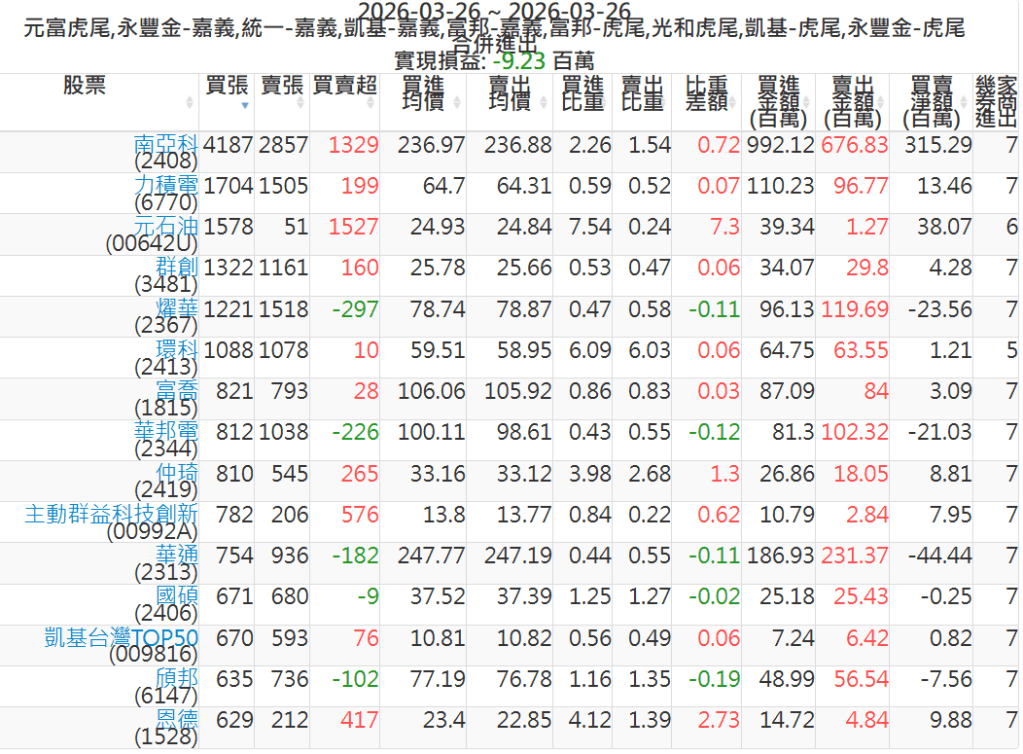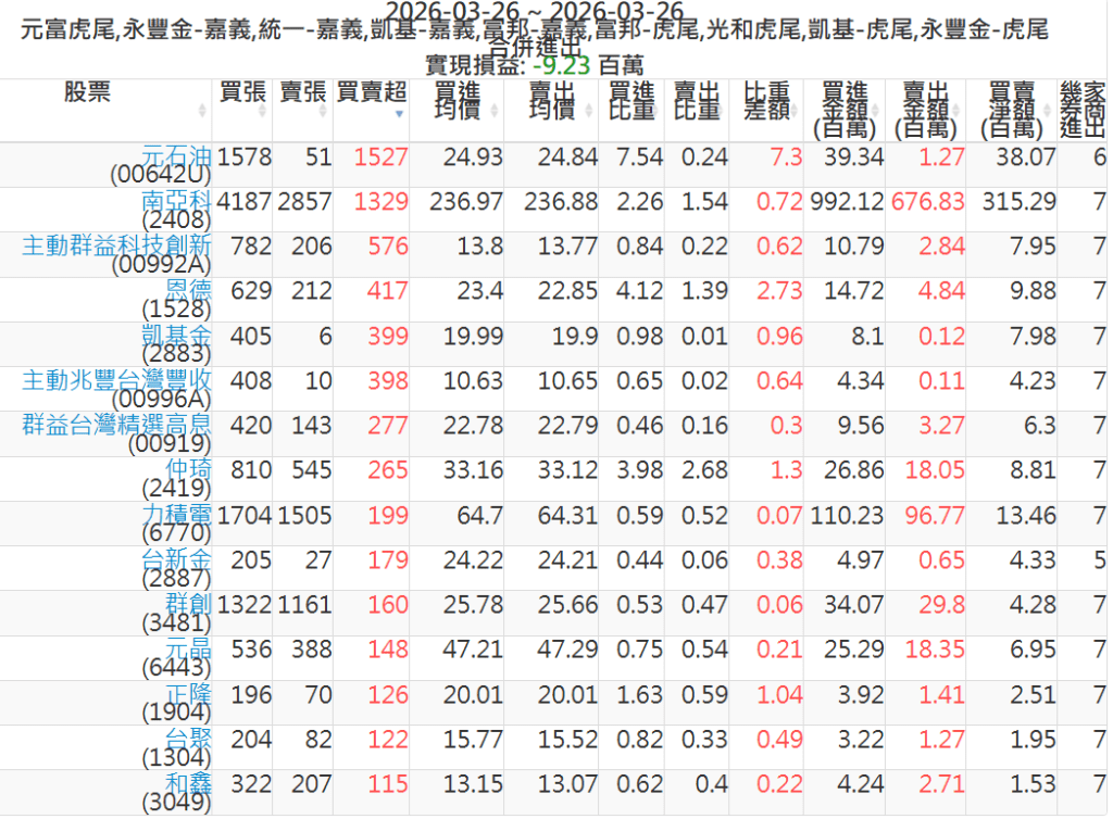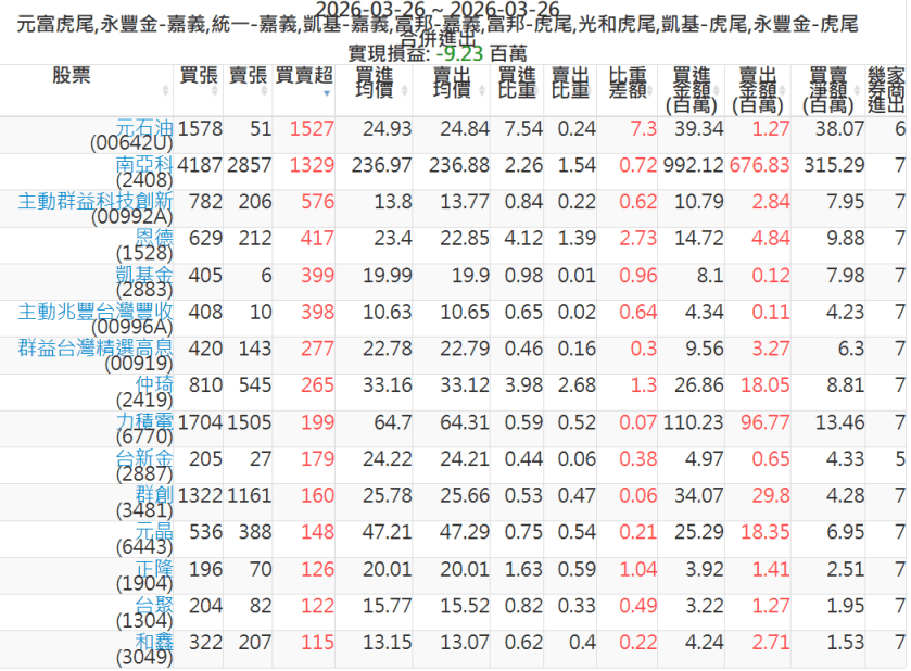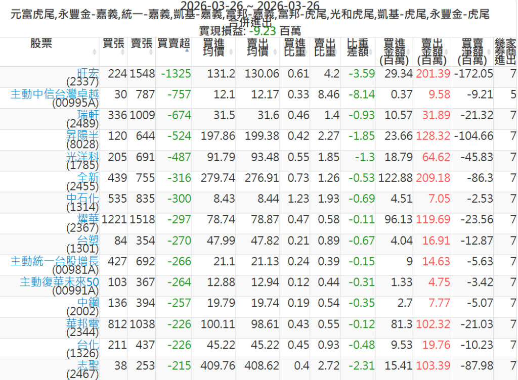 2026-0326主力買賣超個股 2026-03-26 股狗網小編 籌碼面每日資訊 發表留言 可參考下文 『如何查詢當沖、隔日沖分公司券商買賣』 主力當沖券商: 『元富虎尾』,『永豐金嘉義』,『統一嘉義』,『凱基嘉義』,『富邦嘉義』,『富邦虎尾』,『光和虎尾』,『凱基虎尾』,『永豐金虎尾』。 『當沖標的』 『買超股票』 『賣超股票』 免責宣言 本網站文章所提供資訊僅供參考,並無任何推介買賣之意,投資人應自行承擔交易風險。 分享此文: 分享到 X(在新視窗中開啟) X 分享到 Facebook(在新視窗中開啟) Facebook 喜歡 正在載入...