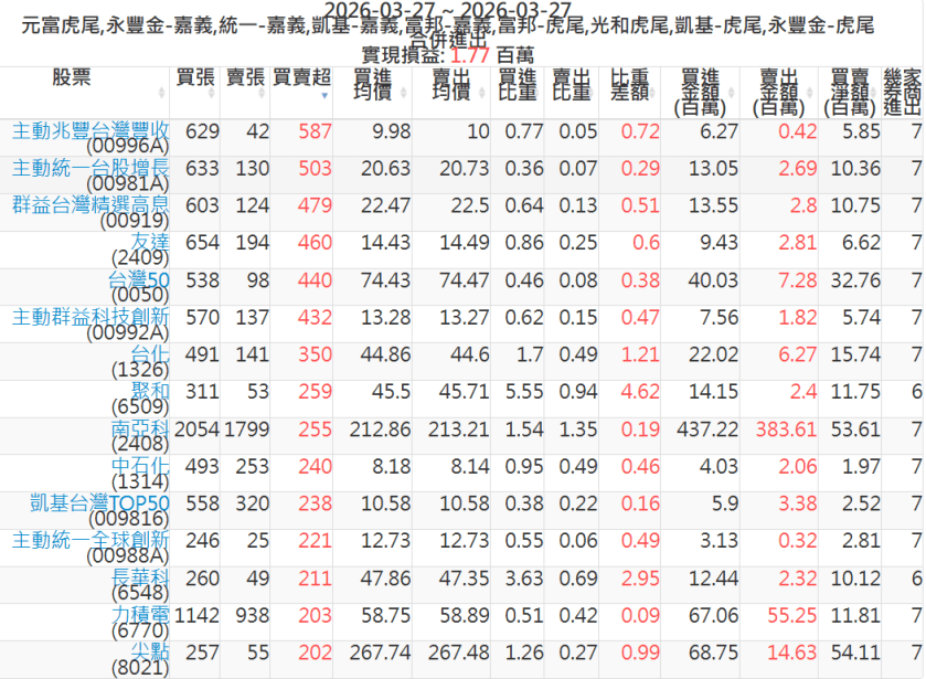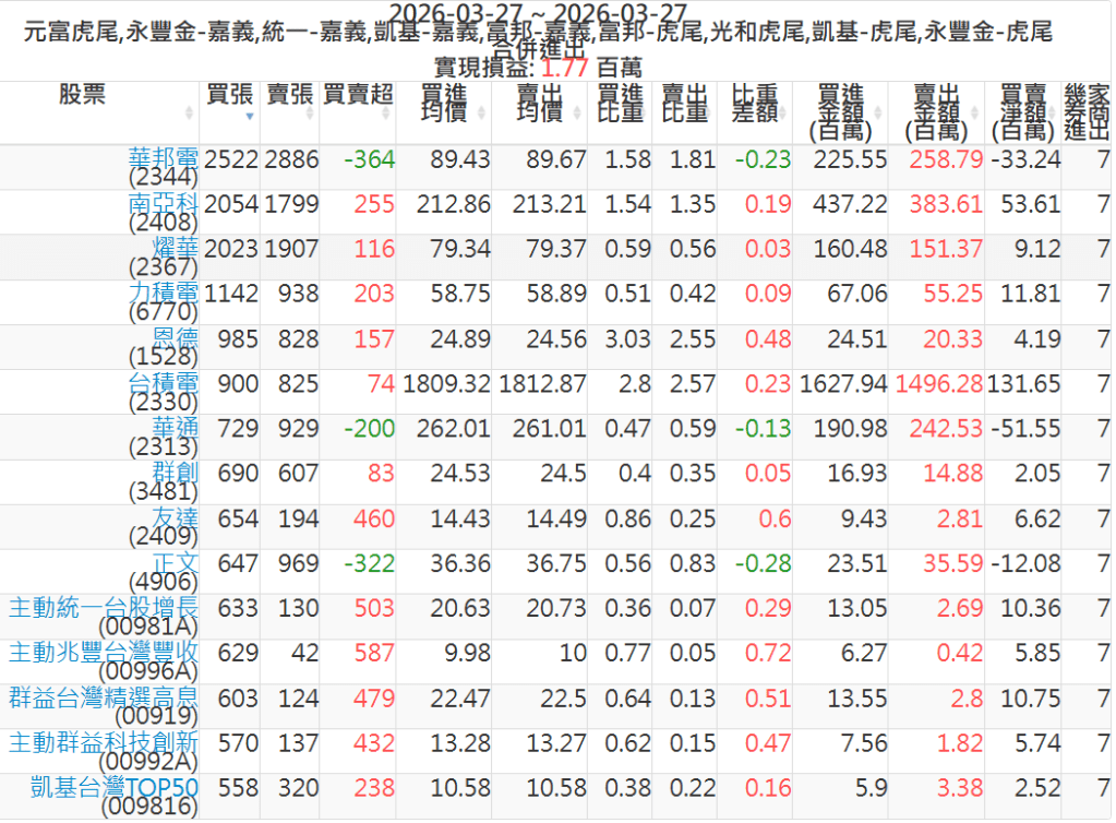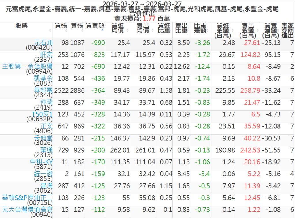 2026-0327主力買賣超個股 2026-03-27 股狗網小編 籌碼面每日資訊 發表留言 可參考下文 『如何查詢當沖、隔日沖分公司券商買賣』 主力當沖券商: 『元富虎尾』,『永豐金嘉義』,『統一嘉義』,『凱基嘉義』,『富邦嘉義』,『富邦虎尾』,『光和虎尾』,『凱基虎尾』,『永豐金虎尾』。 『當沖標的』 『買超股票』 『賣超股票』 免責宣言 本網站文章所提供資訊僅供參考,並無任何推介買賣之意,投資人應自行承擔交易風險。 分享此文: 分享到 X(在新視窗中開啟) X 分享到 Facebook(在新視窗中開啟) Facebook 喜歡 正在載入...