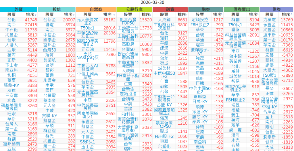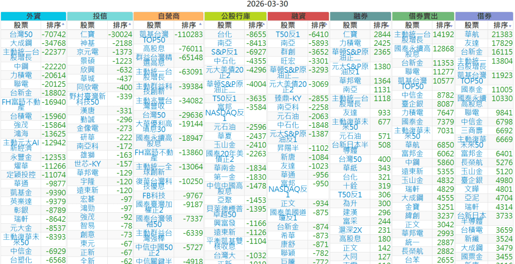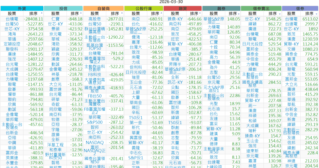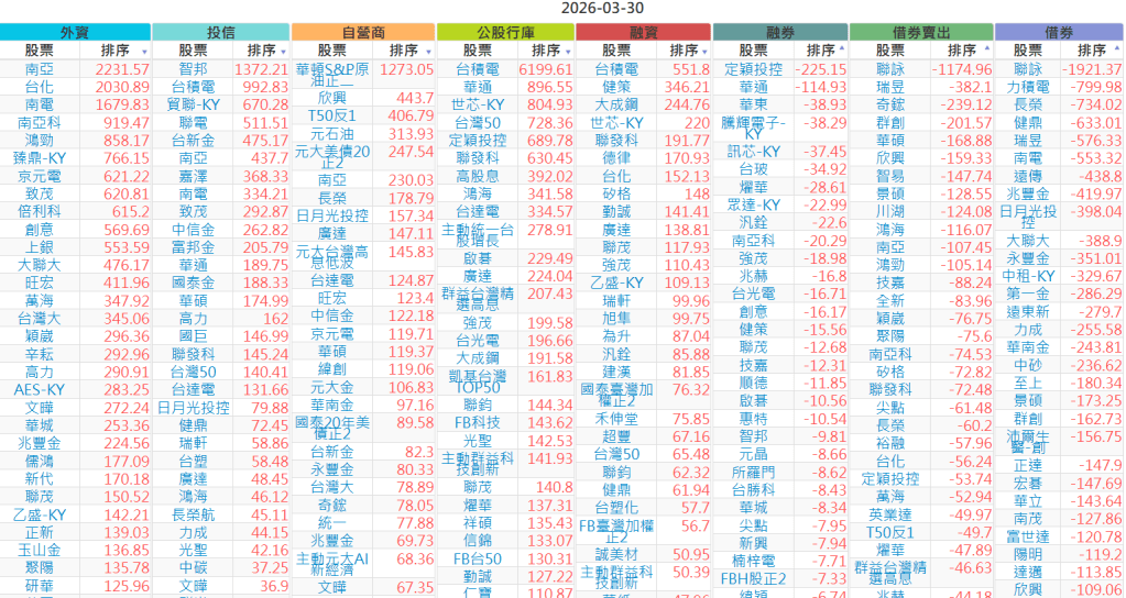 2026-0330【外資、投信】買賣超個股 2026-03-30 股狗網小編 投資誌-大盤 發表留言 上市:【外資、投信】買超(依金額) (單位:百萬) 上市:【外資、投信】賣超(依金額) (單位:百萬) 上市:【外資、投信】買超(依張數) (單位:張數) 上市:【外資、投信】賣超(依張數) (單位:張數) 免責宣言 本網站文章所提供資訊僅供參考,並無任何推介買賣之意,投資人應自行承擔交易風險。 分享此文: 分享到 X(在新視窗中開啟) X 分享到 Facebook(在新視窗中開啟) Facebook 喜歡 正在載入...