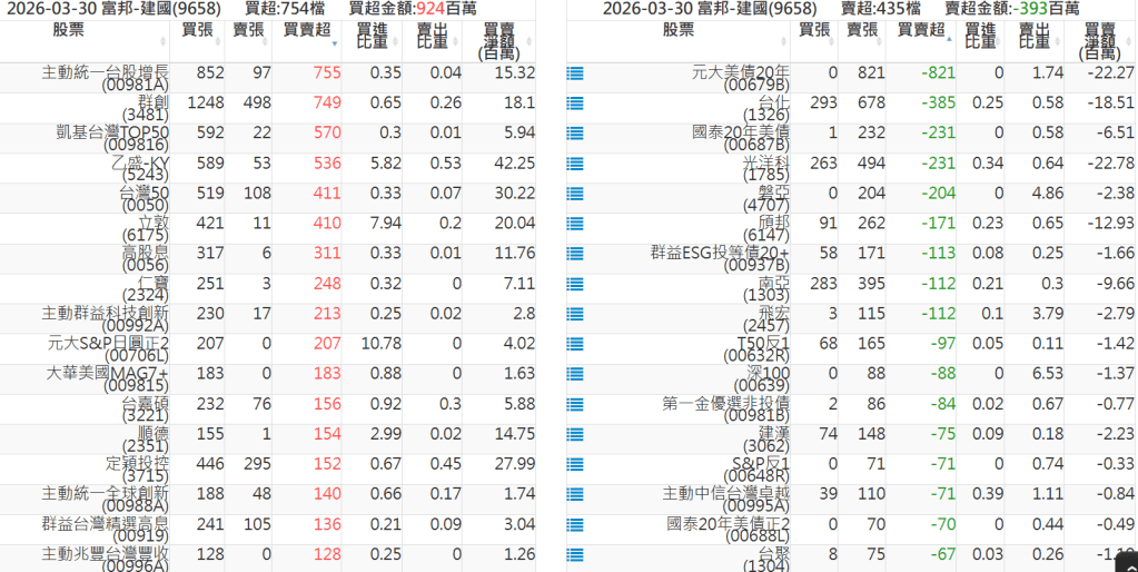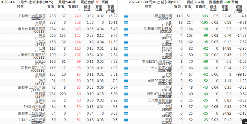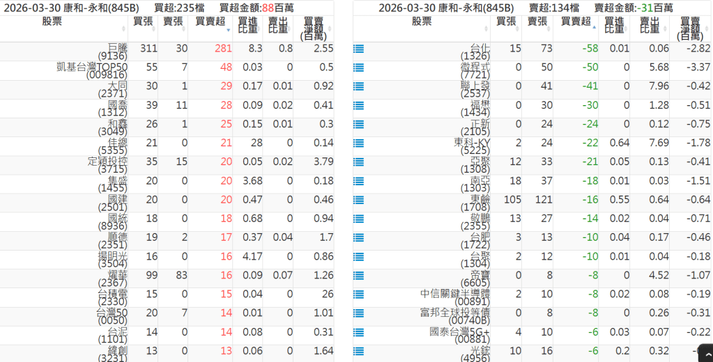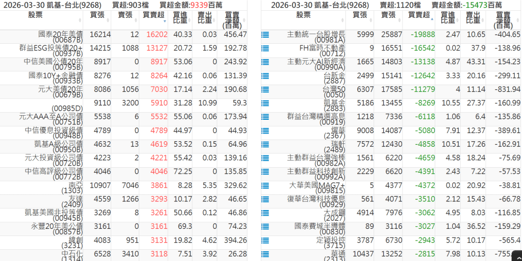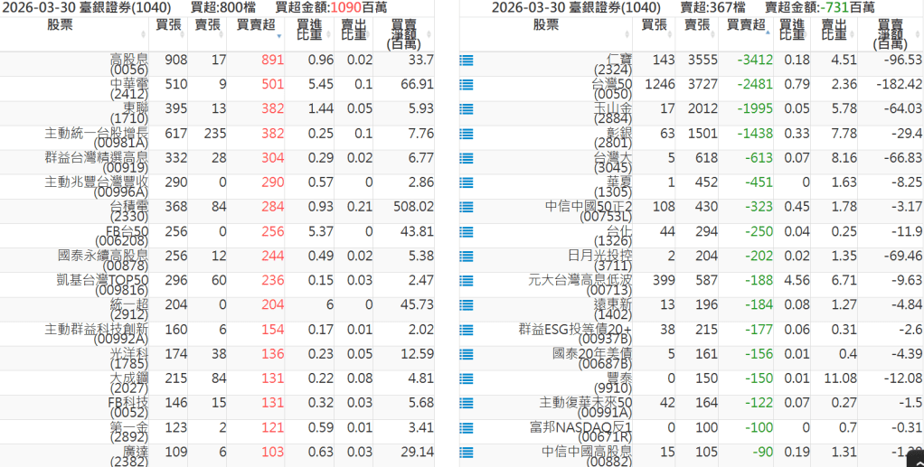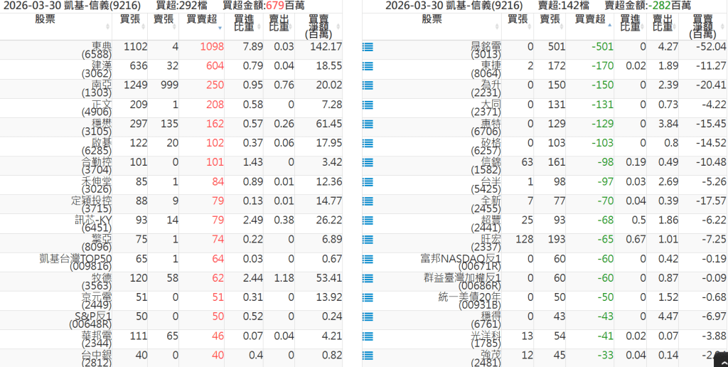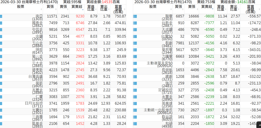 2026-0330關鍵券商買賣超 2026-03-30 股狗網小編 籌碼面每日資訊 發表留言 關鍵券商買賣超: 臺銀證券(1040): 台灣摩根士丹利(1470): 凱基台北(9268): 凱基信義(9216): 元大土城永寧(9875): 康和永和(845B) : 富邦建國(9658): 免責宣言 本網站文章所提供資訊僅供參考,並無任何推介買賣之意,投資人應自行承擔交易風險。 分享此文: 分享到 X(在新視窗中開啟) X 分享到 Facebook(在新視窗中開啟) Facebook 喜歡 正在載入...