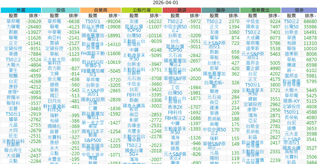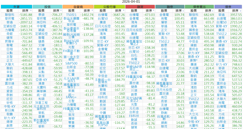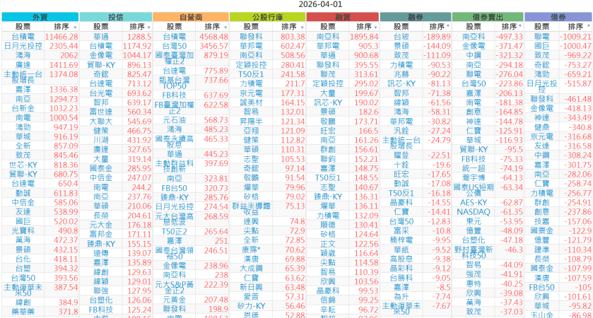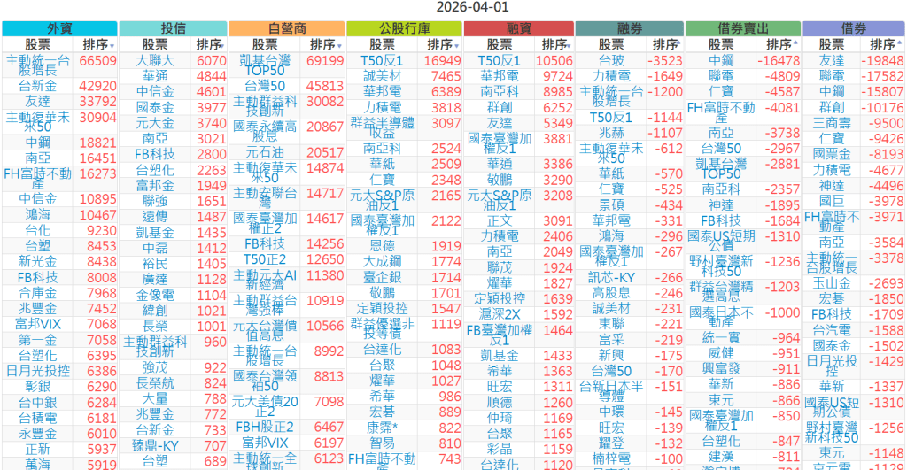 2026-0401【外資、投信】買賣超個股 2026-04-01 股狗網小編 投資誌-大盤 發表留言 上市:【外資、投信】買超(依金額) (單位:百萬) 上市:【外資、投信】賣超(依金額) (單位:百萬) 上市:【外資、投信】買超(依張數) (單位:張數) 上市:【外資、投信】賣超(依張數) (單位:張數) 免責宣言 本網站文章所提供資訊僅供參考,並無任何推介買賣之意,投資人應自行承擔交易風險。 分享此文: 分享到 X(在新視窗中開啟) X 分享到 Facebook(在新視窗中開啟) Facebook 喜歡 正在載入...