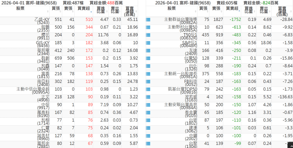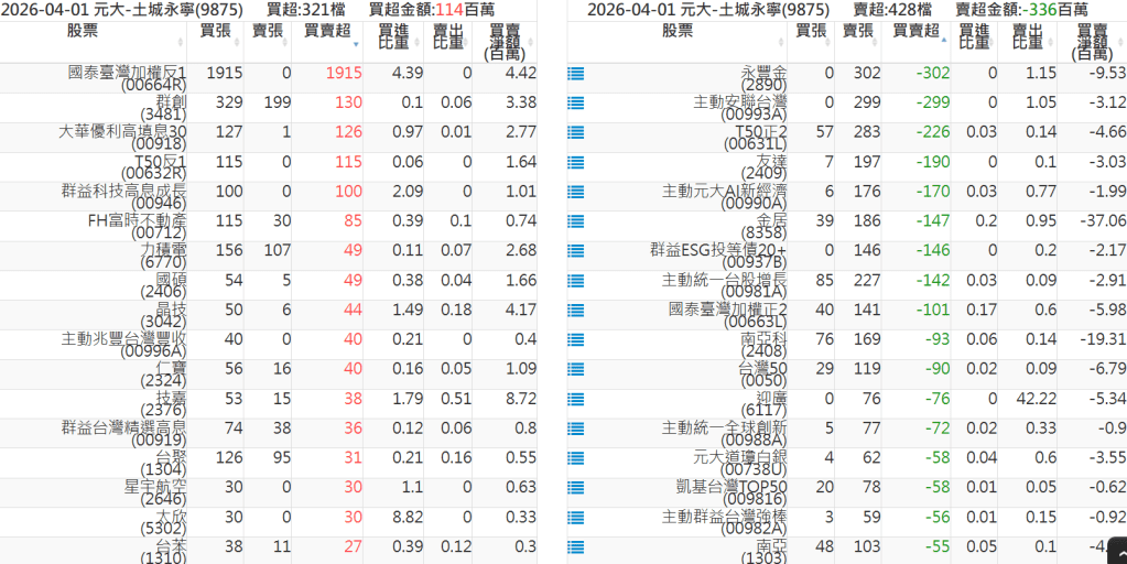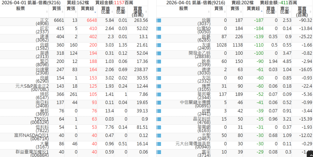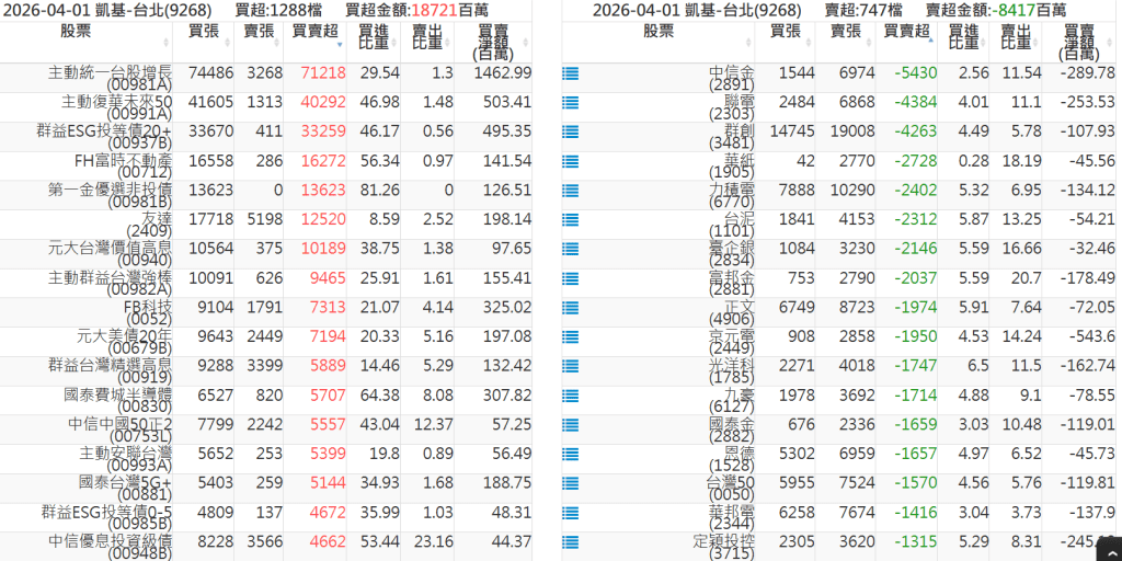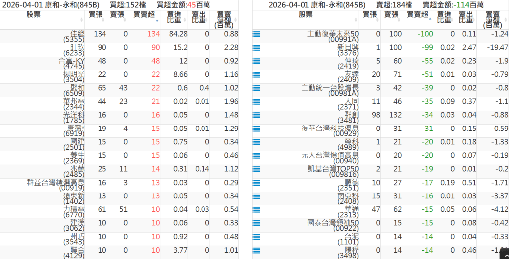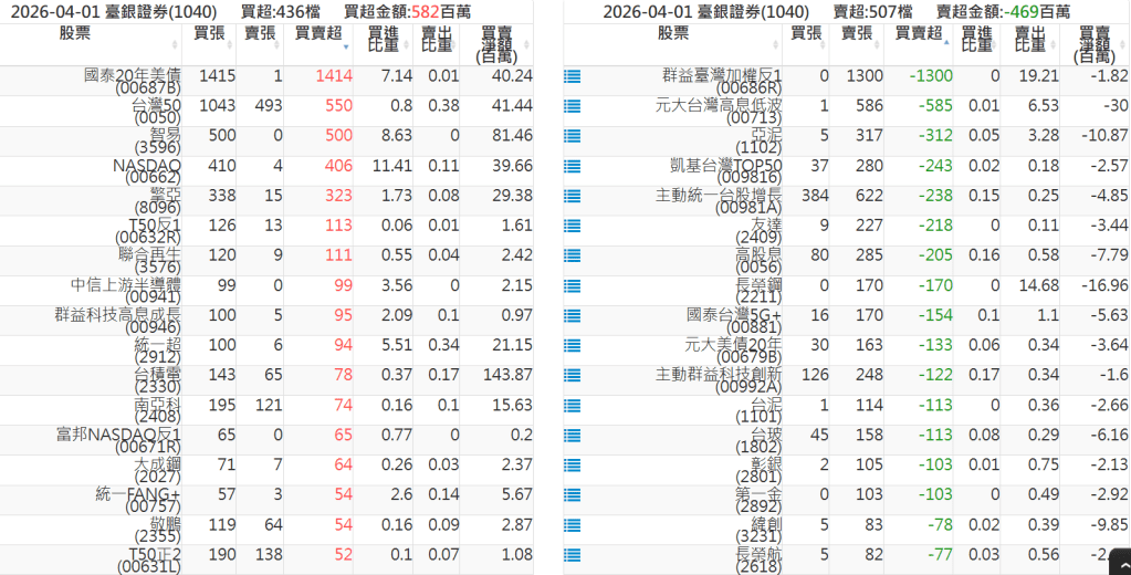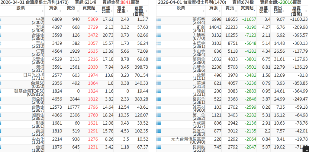 2026-0401關鍵券商買賣超 2026-04-01 股狗網小編 籌碼面每日資訊 發表留言 關鍵券商買賣超: 臺銀證券(1040): 台灣摩根士丹利(1470): 凱基台北(9268): 凱基信義(9216): 元大土城永寧(9875): 康和永和(845B) : 富邦建國(9658): 免責宣言 本網站文章所提供資訊僅供參考,並無任何推介買賣之意,投資人應自行承擔交易風險。 分享此文: 分享到 X(在新視窗中開啟) X 分享到 Facebook(在新視窗中開啟) Facebook 喜歡 正在載入...