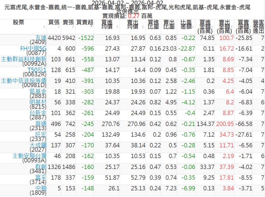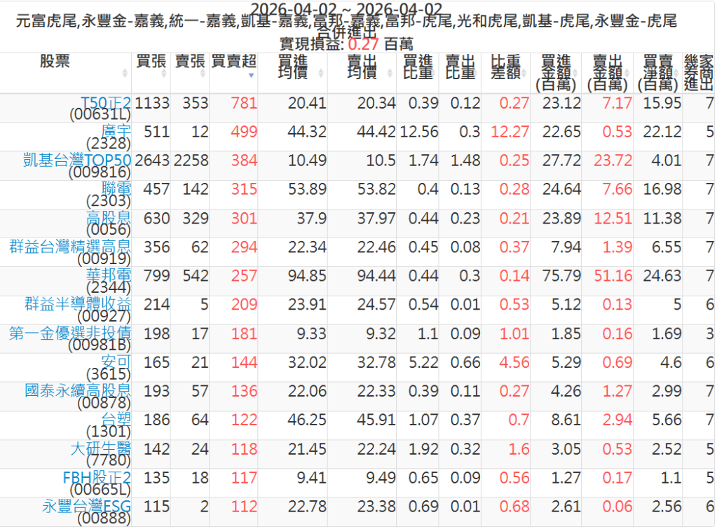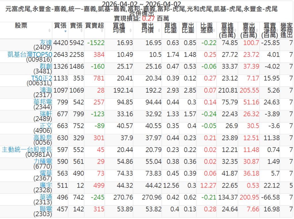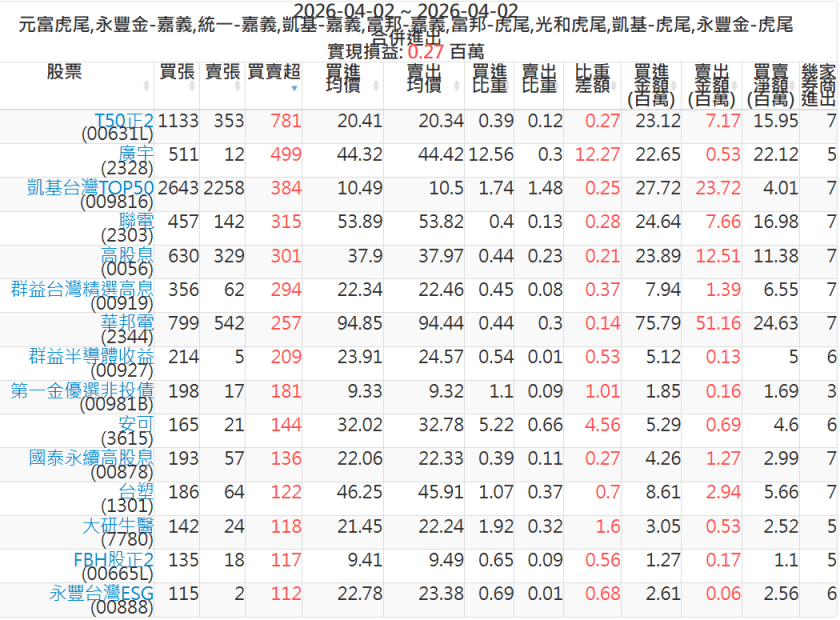 2026-0402主力買賣超個股 2026-04-02 股狗網小編 籌碼面每日資訊 發表留言 可參考下文 『如何查詢當沖、隔日沖分公司券商買賣』 主力當沖券商: 『元富虎尾』,『永豐金嘉義』,『統一嘉義』,『凱基嘉義』,『富邦嘉義』,『富邦虎尾』,『光和虎尾』,『凱基虎尾』,『永豐金虎尾』。 『當沖標的』 『買超股票』 『賣超股票』 免責宣言 本網站文章所提供資訊僅供參考,並無任何推介買賣之意,投資人應自行承擔交易風險。 分享此文: 分享到 X(在新視窗中開啟) X 分享到 Facebook(在新視窗中開啟) Facebook 喜歡 正在載入...
