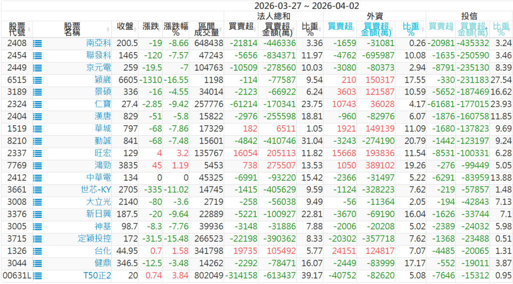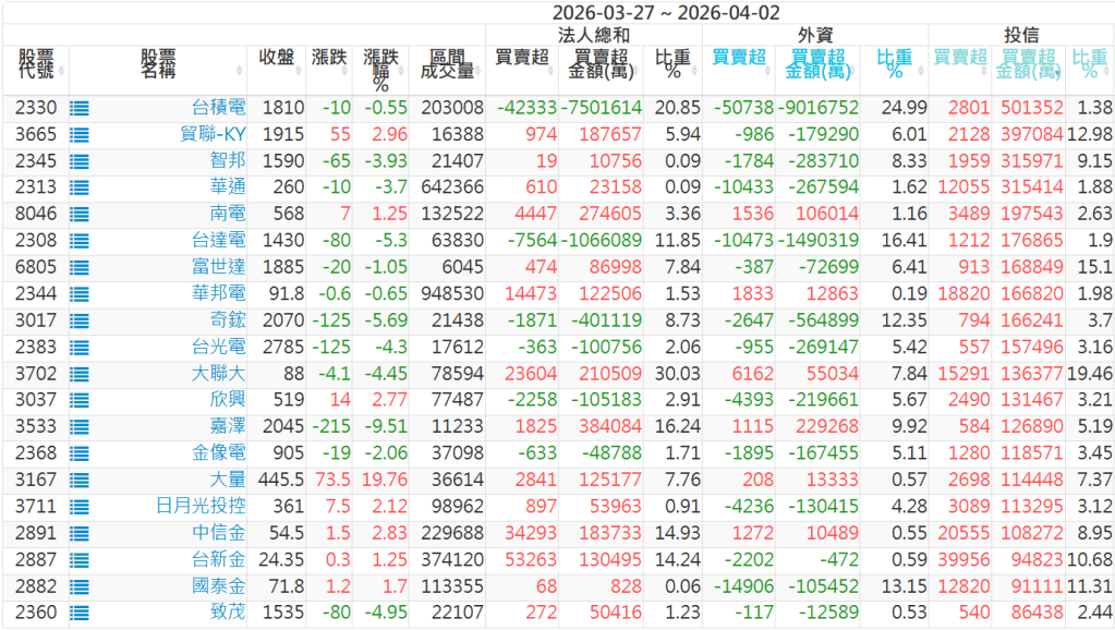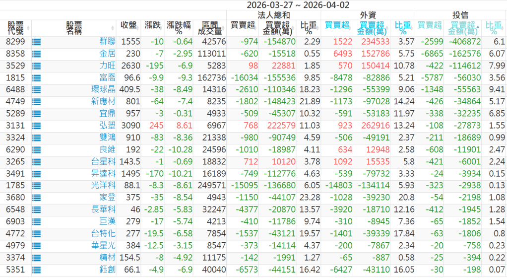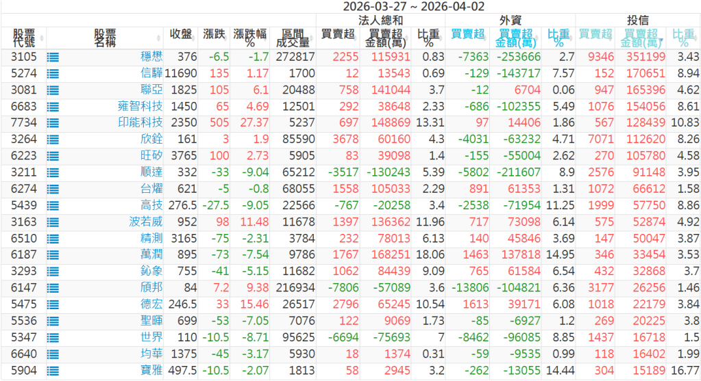 2026/03/27~2026/04/02近5日【投信】買賣超個股 2026-04-06 股狗網小編 籌碼面每日資訊 發表留言 【上市投信買超個股】(以金額排行,單位:萬) 【上市投信賣超個股】(以金額排行,單位:萬) 【上櫃投信買超個股】(以金額排行,單位:萬) 【上櫃投信賣超個股】(以金額排行,單位:萬) 免責宣言 本網站文章所提供資訊僅供參考,並無任何推介買賣之意,投資人應自行承擔交易風險。 分享此文: 分享到 X(在新視窗中開啟) X 分享到 Facebook(在新視窗中開啟) Facebook 喜歡 正在載入...