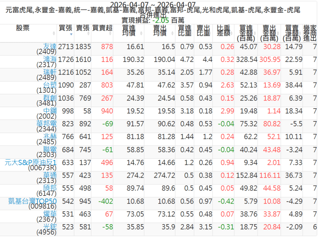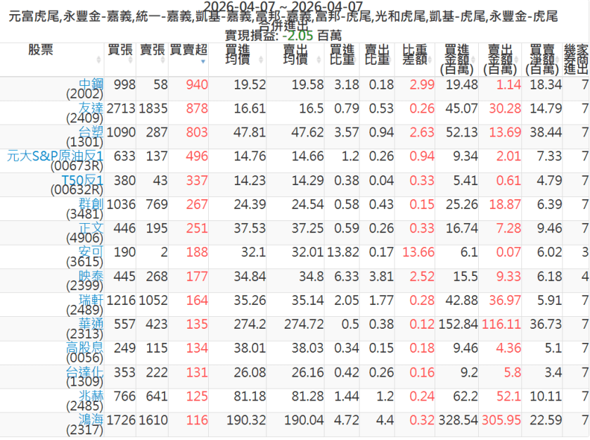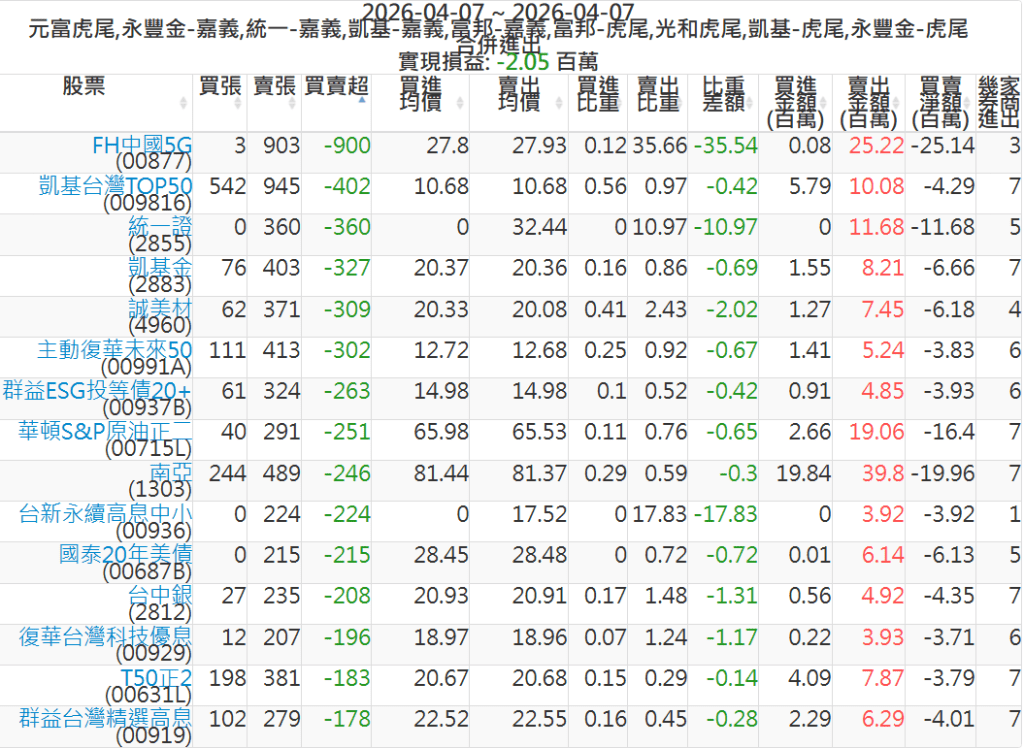 2026-0407主力買賣超個股 2026-04-07 股狗網小編 籌碼面每日資訊 發表留言 可參考下文 『如何查詢當沖、隔日沖分公司券商買賣』 主力當沖券商: 『元富虎尾』,『永豐金嘉義』,『統一嘉義』,『凱基嘉義』,『富邦嘉義』,『富邦虎尾』,『光和虎尾』,『凱基虎尾』,『永豐金虎尾』。 『當沖標的』 『買超股票』 『賣超股票』 免責宣言 本網站文章所提供資訊僅供參考,並無任何推介買賣之意,投資人應自行承擔交易風險。 分享此文: 分享到 X(在新視窗中開啟) X 分享到 Facebook(在新視窗中開啟) Facebook 喜歡 正在載入...
