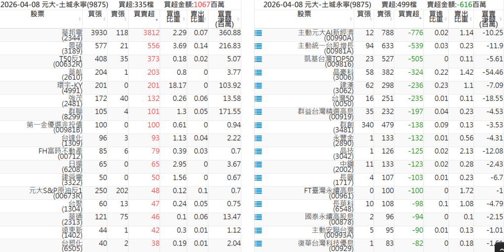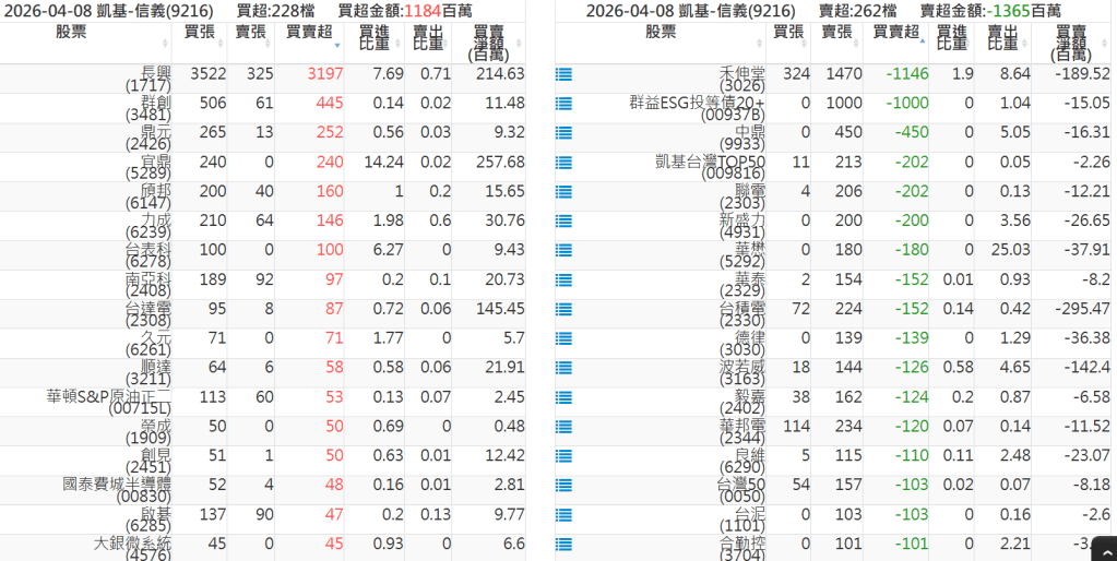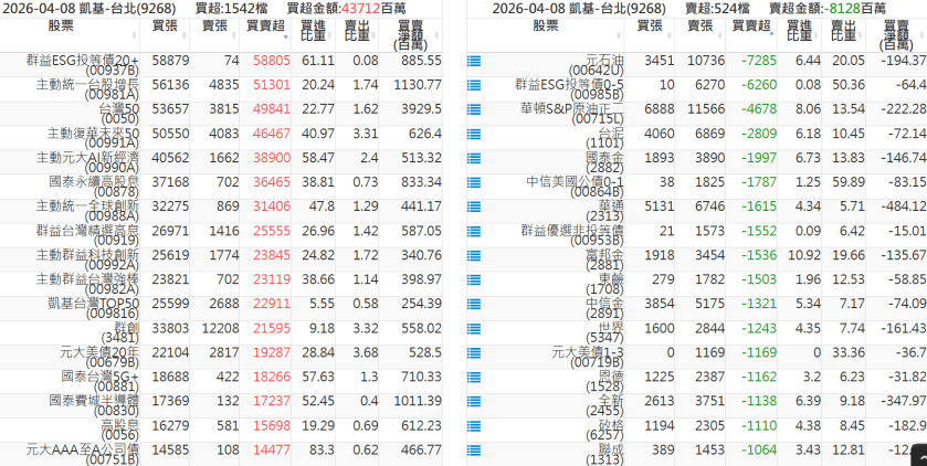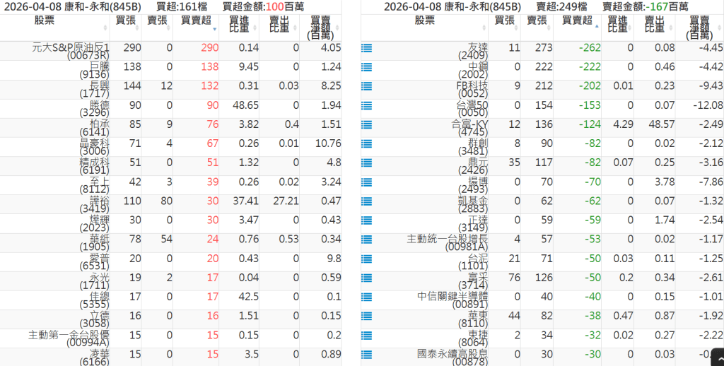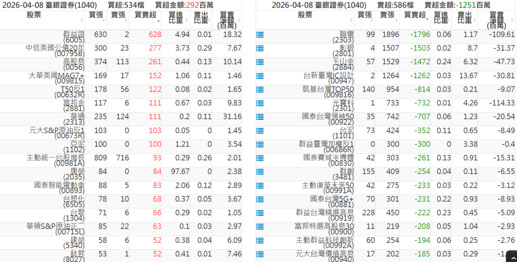 2026-0408關鍵券商買賣超 2026-04-08 股狗網小編 籌碼面每日資訊 發表留言 關鍵券商買賣超: 臺銀證券(1040): 台灣摩根士丹利(1470): 凱基台北(9268): 凱基信義(9216): 元大土城永寧(9875): 康和永和(845B) : 富邦建國(9658): 免責宣言 本網站文章所提供資訊僅供參考,並無任何推介買賣之意,投資人應自行承擔交易風險。 分享此文: 分享到 X(在新視窗中開啟) X 分享到 Facebook(在新視窗中開啟) Facebook 喜歡 正在載入...