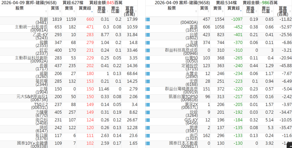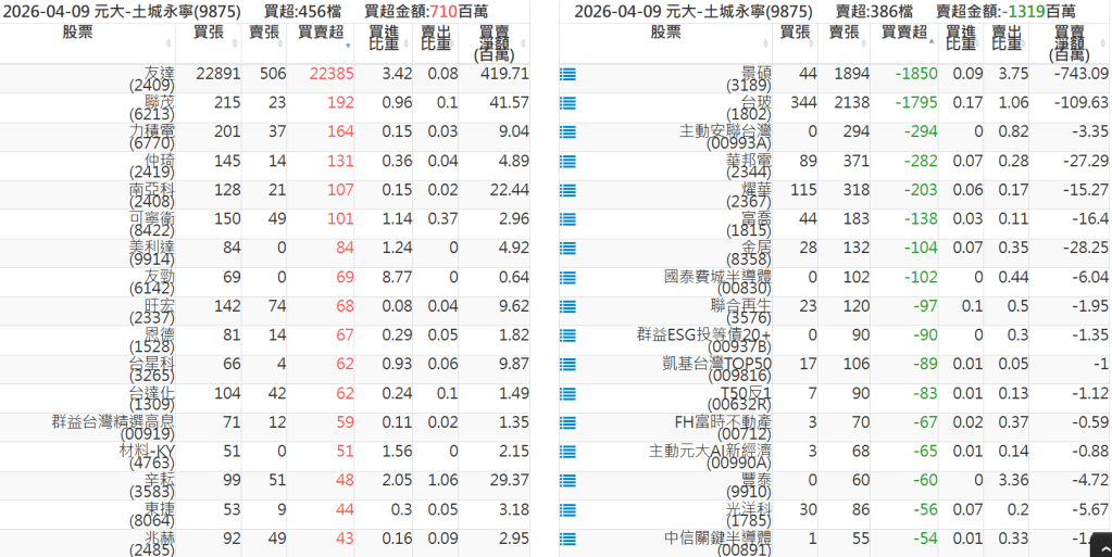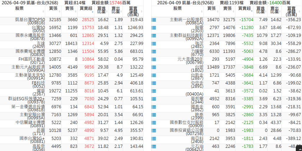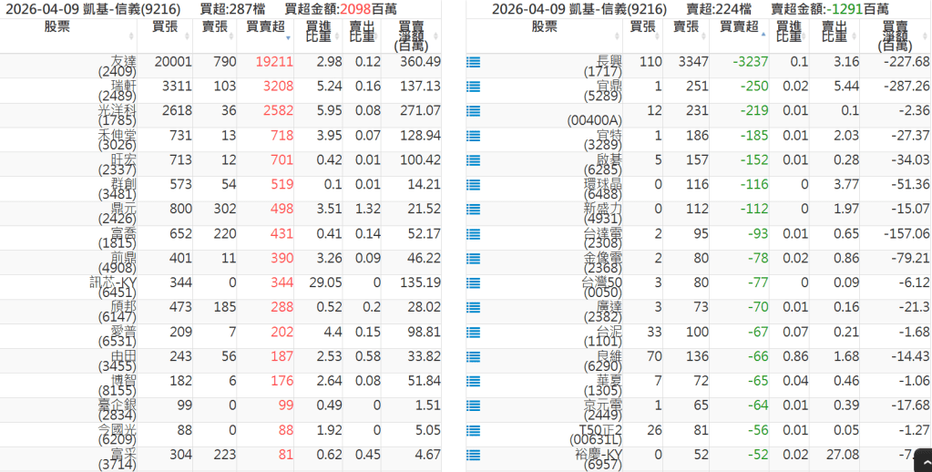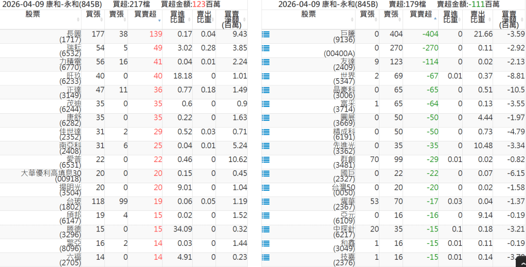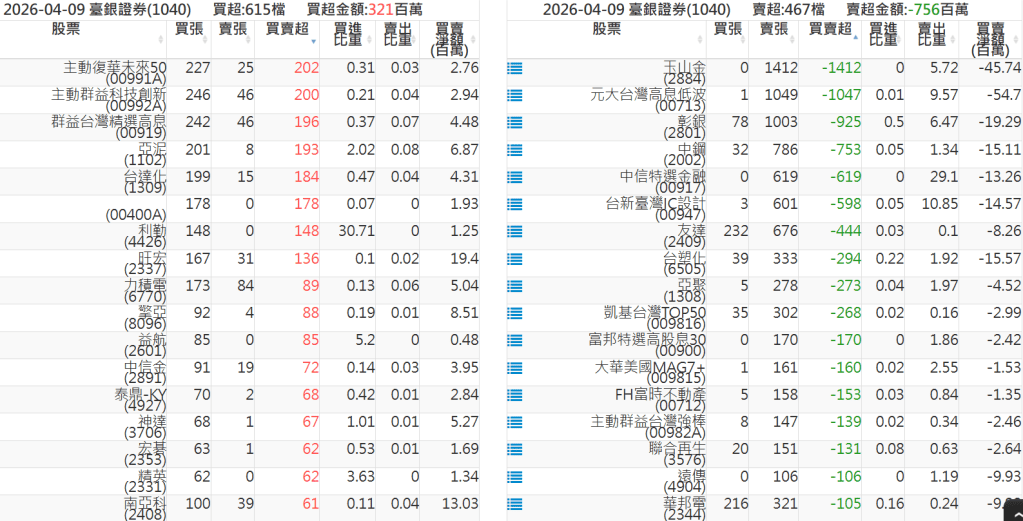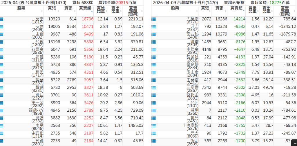 2026-0409關鍵券商買賣超 2026-04-09 股狗網小編 籌碼面每日資訊 發表留言 關鍵券商買賣超: 臺銀證券(1040): 台灣摩根士丹利(1470): 凱基台北(9268): 凱基信義(9216): 元大土城永寧(9875): 康和永和(845B) : 富邦建國(9658): 免責宣言 本網站文章所提供資訊僅供參考,並無任何推介買賣之意,投資人應自行承擔交易風險。 分享此文: 分享到 X(在新視窗中開啟) X 分享到 Facebook(在新視窗中開啟) Facebook 喜歡 正在載入...