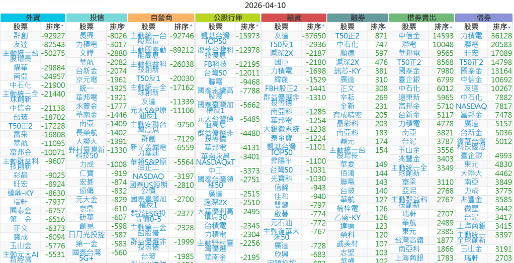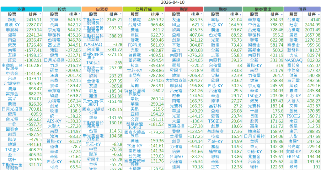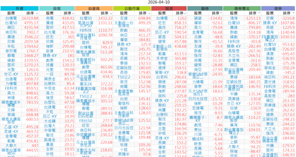 2026-0410【外資、投信】買賣超個股 2026-04-10 股狗網小編 投資誌-大盤 發表留言 上市:【外資、投信】買超(依金額) (單位:百萬) 上市:【外資、投信】賣超(依金額) (單位:百萬) 上市:【外資、投信】買超(依張數) (單位:張數) 上市:【外資、投信】賣超(依張數) (單位:張數) 免責宣言 本網站文章所提供資訊僅供參考,並無任何推介買賣之意,投資人應自行承擔交易風險。 分享此文: 分享到 X(在新視窗中開啟) X 分享到 Facebook(在新視窗中開啟) Facebook 喜歡 正在載入...