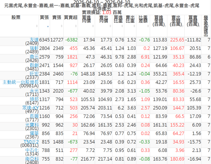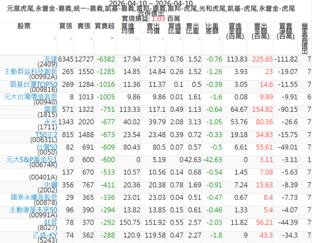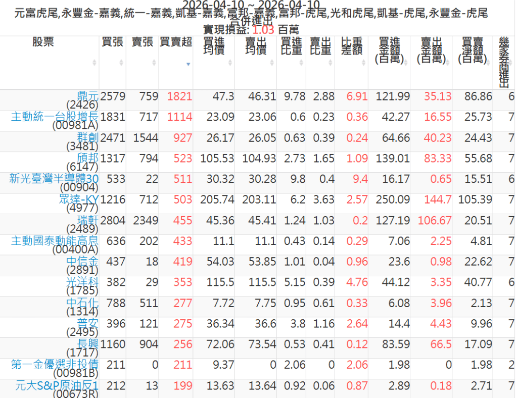 2026-0410主力買賣超個股 2026-04-10 股狗網小編 籌碼面每日資訊 發表留言 可參考下文 『如何查詢當沖、隔日沖分公司券商買賣』 主力當沖券商: 『元富虎尾』,『永豐金嘉義』,『統一嘉義』,『凱基嘉義』,『富邦嘉義』,『富邦虎尾』,『光和虎尾』,『凱基虎尾』,『永豐金虎尾』。 『當沖標的』 『買超股票』 『賣超股票』 免責宣言 本網站文章所提供資訊僅供參考,並無任何推介買賣之意,投資人應自行承擔交易風險。 分享此文: 分享到 X(在新視窗中開啟) X 分享到 Facebook(在新視窗中開啟) Facebook 喜歡 正在載入...