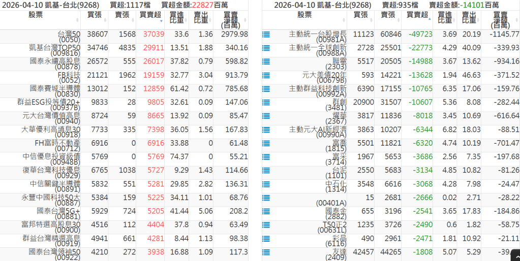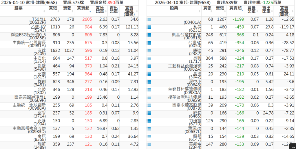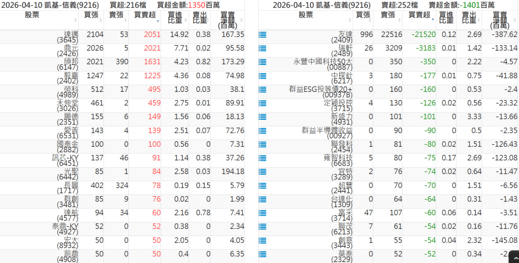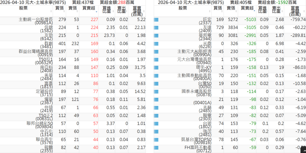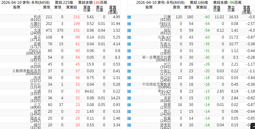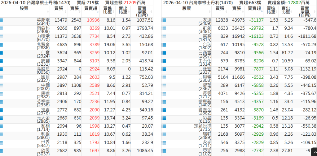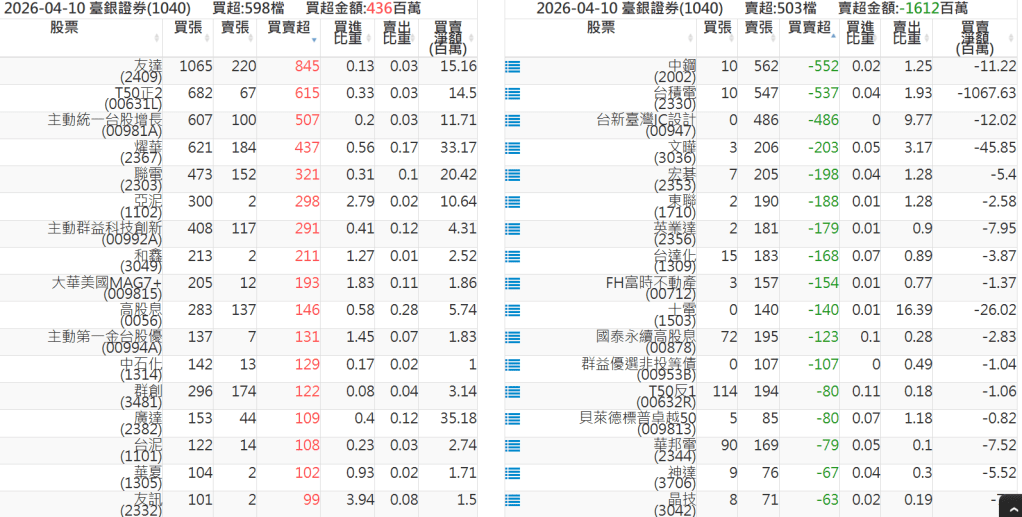 2026-0410關鍵券商買賣超 2026-04-10 股狗網小編 籌碼面每日資訊 發表留言 關鍵券商買賣超: 臺銀證券(1040): 台灣摩根士丹利(1470): 凱基台北(9268): 凱基信義(9216): 元大土城永寧(9875): 康和永和(845B) : 富邦建國(9658): 免責宣言 本網站文章所提供資訊僅供參考,並無任何推介買賣之意,投資人應自行承擔交易風險。 分享此文: 分享到 X(在新視窗中開啟) X 分享到 Facebook(在新視窗中開啟) Facebook 喜歡 正在載入...