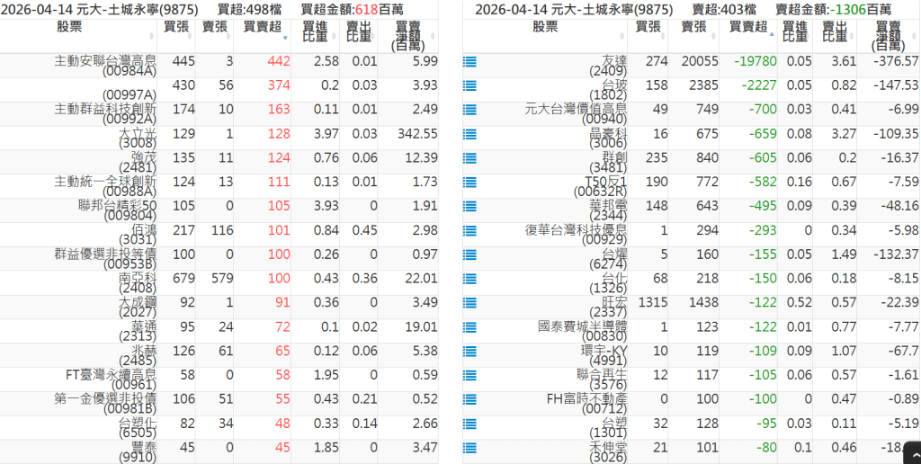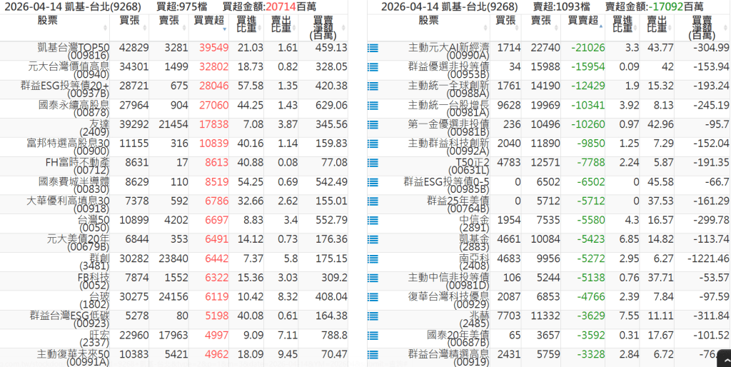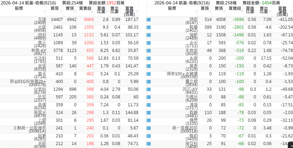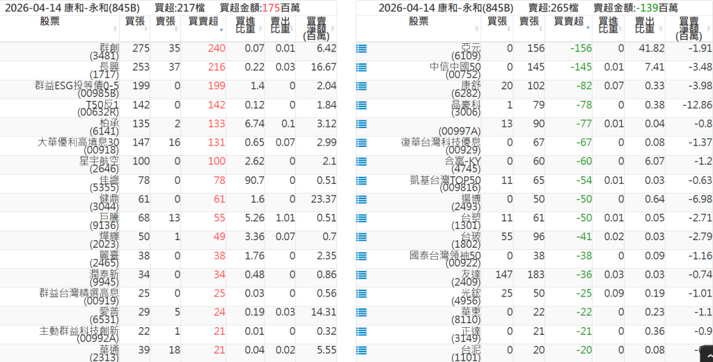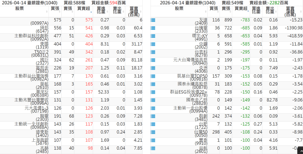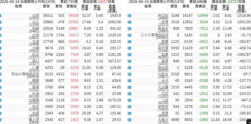 2026-0414關鍵券商買賣超 2026-04-14 股狗網小編 籌碼面每日資訊 發表留言 關鍵券商買賣超: 臺銀證券(1040): 台灣摩根士丹利(1470): 凱基台北(9268): 凱基信義(9216): 元大土城永寧(9875): 康和永和(845B) : 富邦建國(9658): 免責宣言 本網站文章所提供資訊僅供參考,並無任何推介買賣之意,投資人應自行承擔交易風險。 分享此文: 分享到 X(在新視窗中開啟) X 分享到 Facebook(在新視窗中開啟) Facebook 喜歡 正在載入...