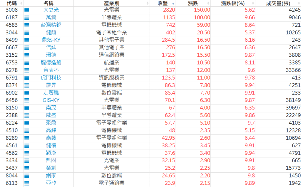 2026-0415日新高爆量上漲股 2026-04-15 股狗網小編 選股條件 發表留言 利用股狗選股的選股條件可以【挑選突破20日新高,爆量上漲起漲點股票】 1.股狗選股 https://www.stockdog.com.tw 2.選股條件: a.收盤價創20日新高 b.當日漲幅 > 2% C.成交量大於5日均量2倍 免責宣言 本網站文章所提供資訊僅供參考,並無任何推介買賣之意,投資人應自行承擔交易風險。 分享此文: 分享到 X(在新視窗中開啟) X 分享到 Facebook(在新視窗中開啟) Facebook 喜歡 正在載入...