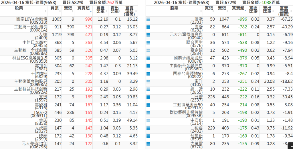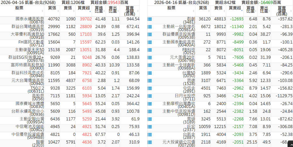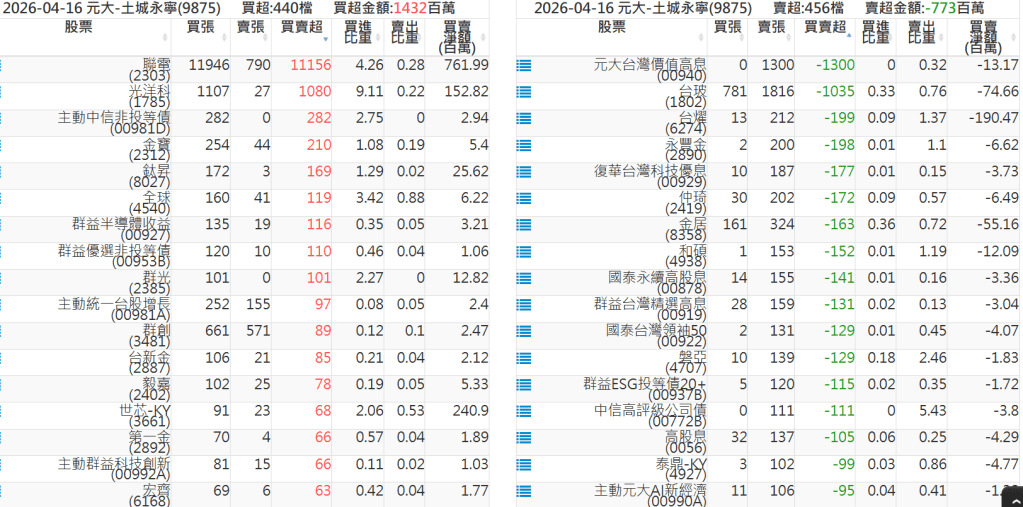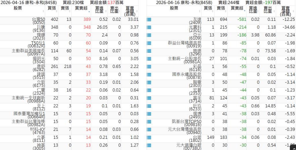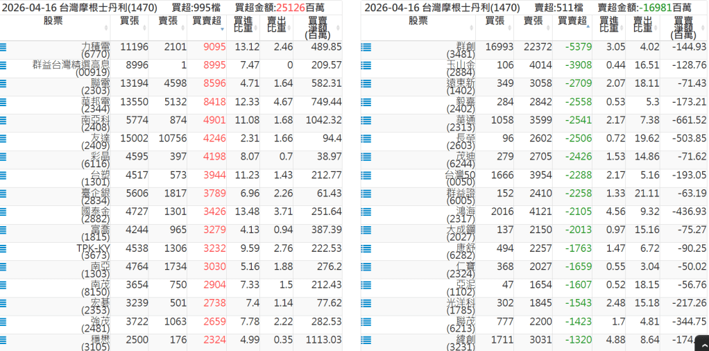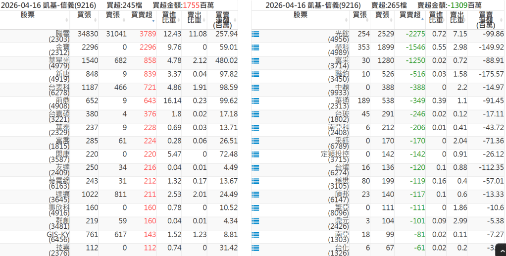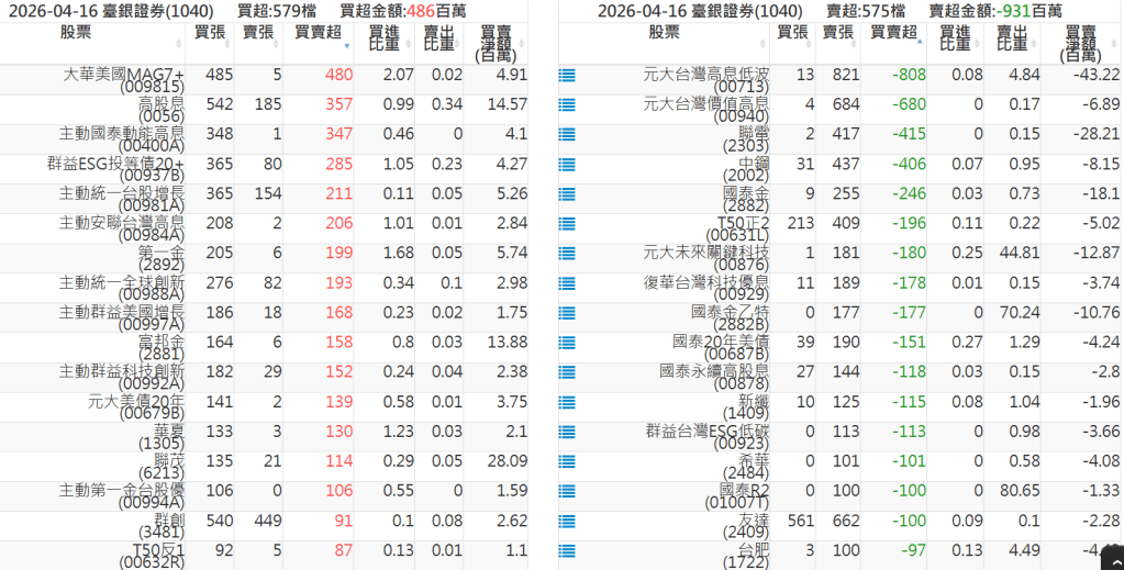 2026-0416關鍵券商買賣超 2026-04-16 股狗網小編 籌碼面每日資訊 發表留言 關鍵券商買賣超: 臺銀證券(1040): 台灣摩根士丹利(1470): 凱基台北(9268): 凱基信義(9216): 元大土城永寧(9875): 康和永和(845B) : 富邦建國(9658): 免責宣言 本網站文章所提供資訊僅供參考,並無任何推介買賣之意,投資人應自行承擔交易風險。 分享此文: 分享到 X(在新視窗中開啟) X 分享到 Facebook(在新視窗中開啟) Facebook 喜歡 正在載入...