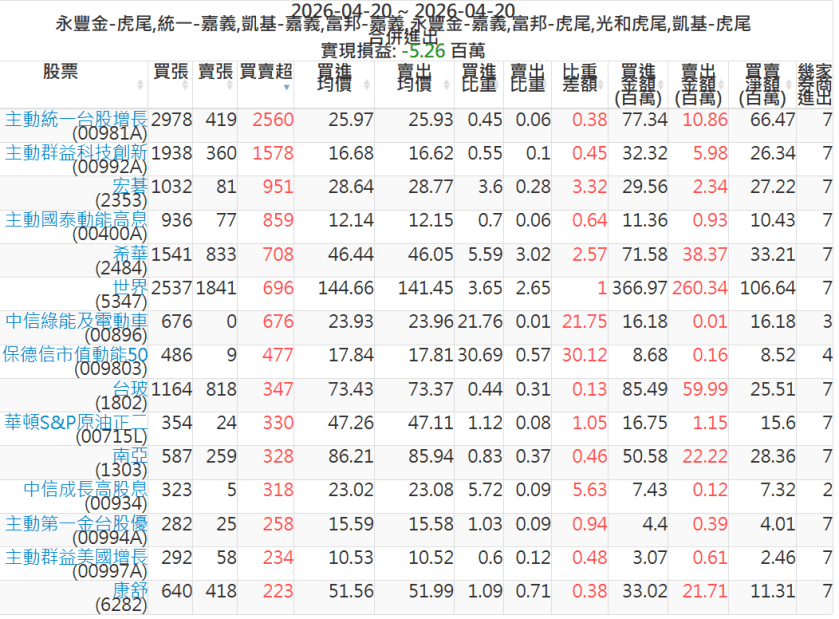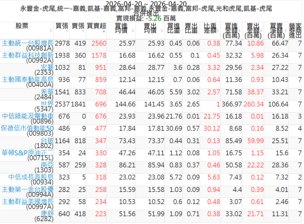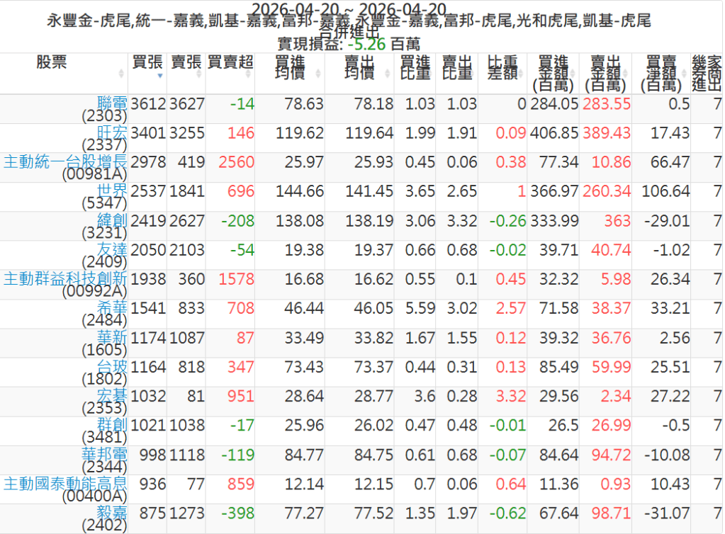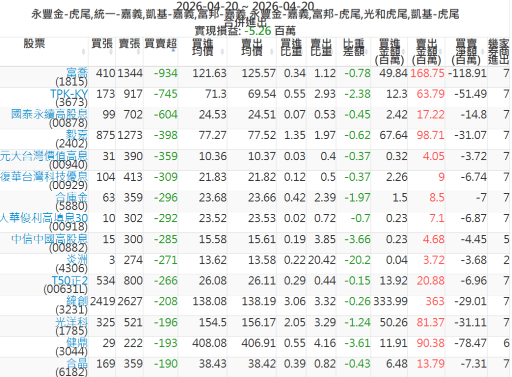 2026-0420主力買賣超個股 2026-04-20 股狗網小編 籌碼面每日資訊 發表留言 可參考下文 『如何查詢當沖、隔日沖分公司券商買賣』 主力當沖券商: 『元富虎尾』,『永豐金嘉義』,『統一嘉義』,『凱基嘉義』,『富邦嘉義』,『富邦虎尾』,『光和虎尾』,『凱基虎尾』,『永豐金虎尾』。 『當沖標的』 『買超股票』 『賣超股票』 免責宣言 本網站文章所提供資訊僅供參考,並無任何推介買賣之意,投資人應自行承擔交易風險。 分享此文: 分享到 X(在新視窗中開啟) X 分享到 Facebook(在新視窗中開啟) Facebook 喜歡 正在載入...