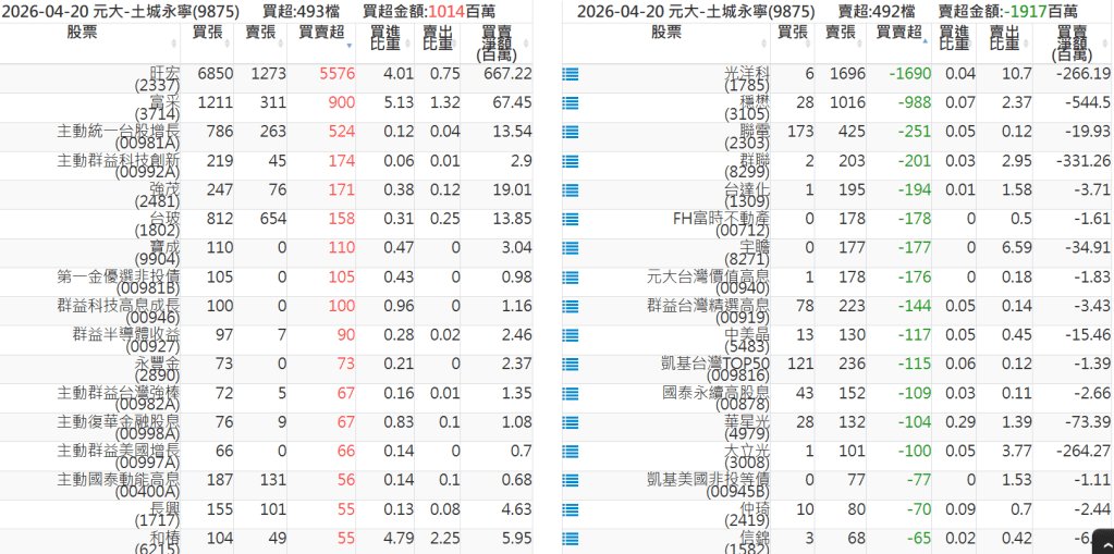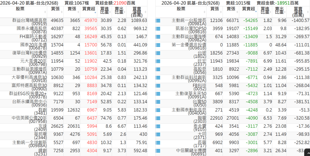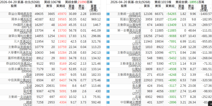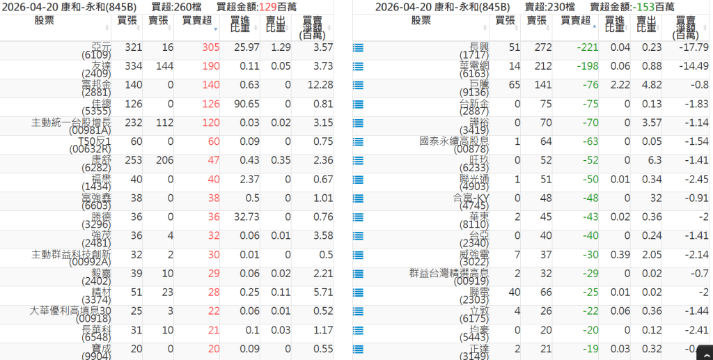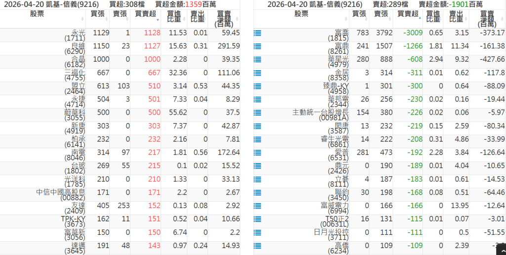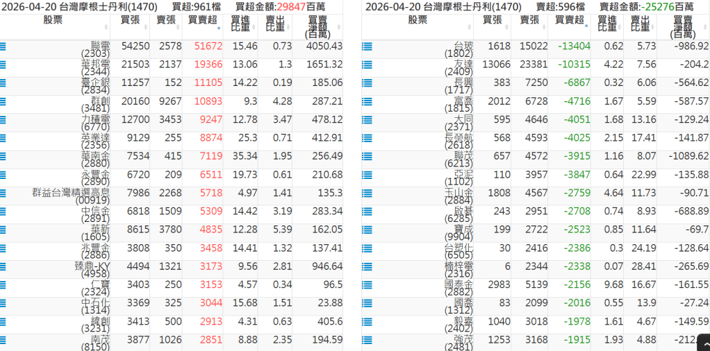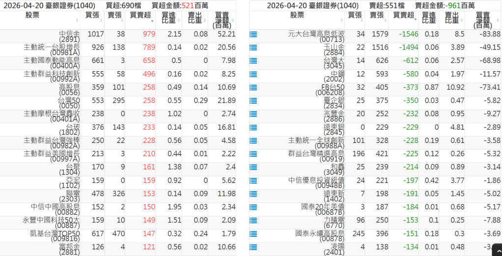 2026-0420關鍵券商買賣超 2026-04-20 股狗網小編 籌碼面每日資訊 發表留言 關鍵券商買賣超: 臺銀證券(1040): 台灣摩根士丹利(1470): 凱基台北(9268): 凱基信義(9216): 元大土城永寧(9875): 康和永和(845B) : 富邦建國(9658): 免責宣言 本網站文章所提供資訊僅供參考,並無任何推介買賣之意,投資人應自行承擔交易風險。 分享此文: 分享到 X(在新視窗中開啟) X 分享到 Facebook(在新視窗中開啟) Facebook 喜歡 正在載入...