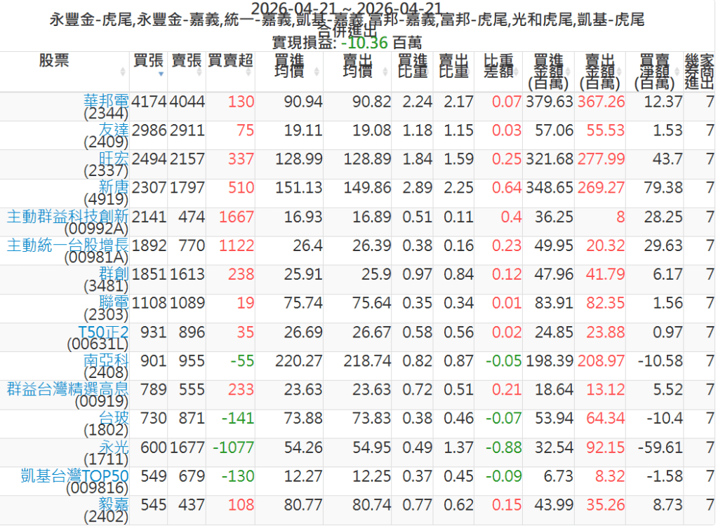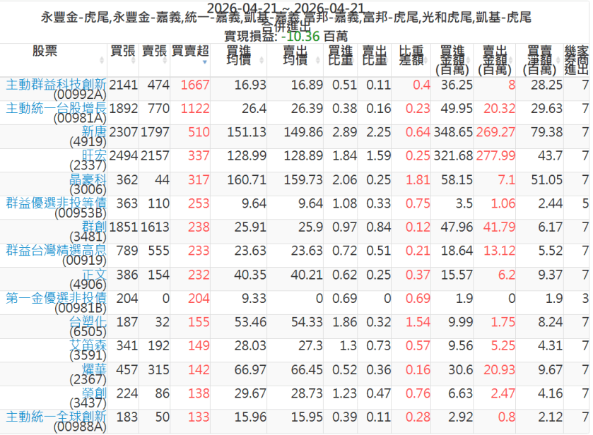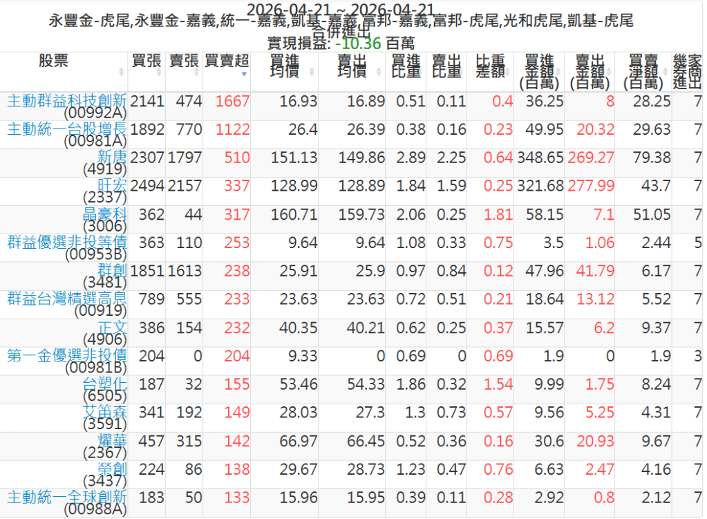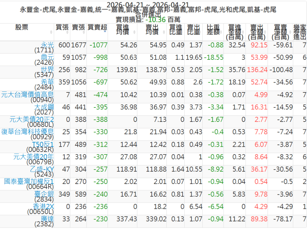 2026-0421主力買賣超個股 2026-04-21 股狗網小編 籌碼面每日資訊 發表留言 可參考下文 『如何查詢當沖、隔日沖分公司券商買賣』 主力當沖券商: 『元富虎尾』,『永豐金嘉義』,『統一嘉義』,『凱基嘉義』,『富邦嘉義』,『富邦虎尾』,『光和虎尾』,『凱基虎尾』,『永豐金虎尾』。 『當沖標的』 『買超股票』 『賣超股票』 免責宣言 本網站文章所提供資訊僅供參考,並無任何推介買賣之意,投資人應自行承擔交易風險。 分享此文: 分享到 X(在新視窗中開啟) X 分享到 Facebook(在新視窗中開啟) Facebook 喜歡 正在載入...