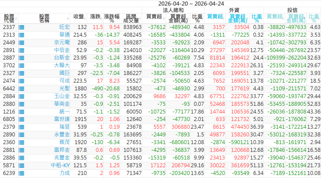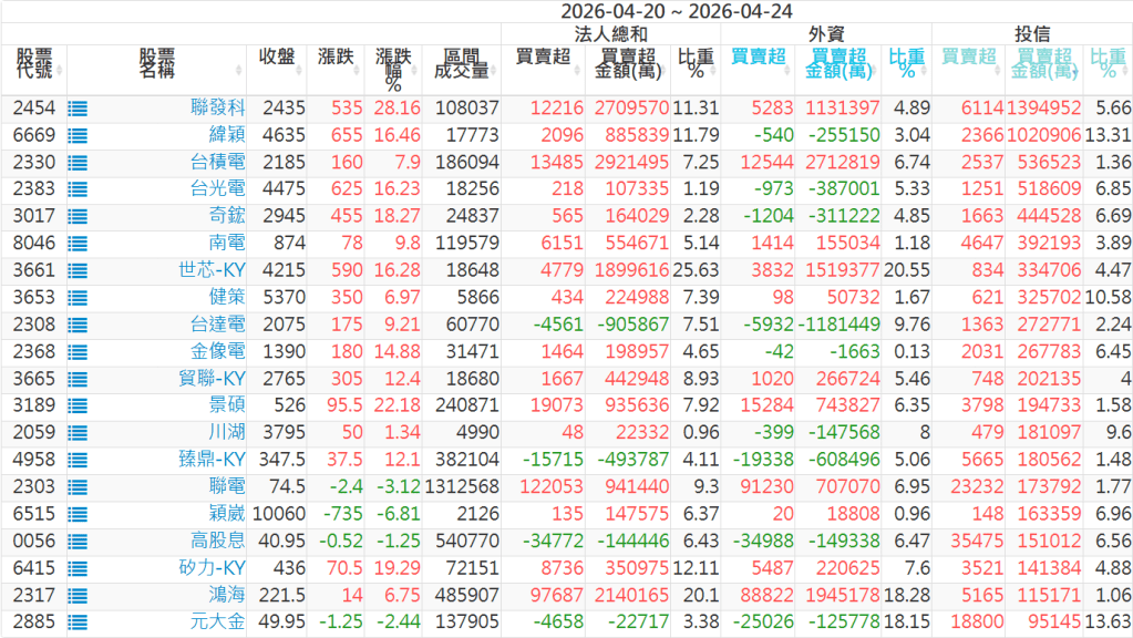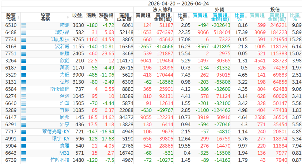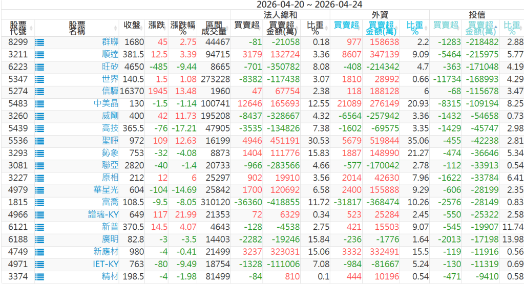 2026/04/20~2026/04/24近5日【投信】買賣超個股 2026-04-26 股狗網小編 籌碼面每日資訊 發表留言 【上市投信買超個股】(以金額排行,單位:萬) 【上市投信賣超個股】(以金額排行,單位:萬) 【上櫃投信買超個股】(以金額排行,單位:萬) 【上櫃投信賣超個股】(以金額排行,單位:萬) 免責宣言 本網站文章所提供資訊僅供參考,並無任何推介買賣之意,投資人應自行承擔交易風險。 分享此文: 分享到 X(在新視窗中開啟) X 分享到 Facebook(在新視窗中開啟) Facebook 喜歡 正在載入...