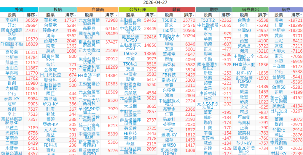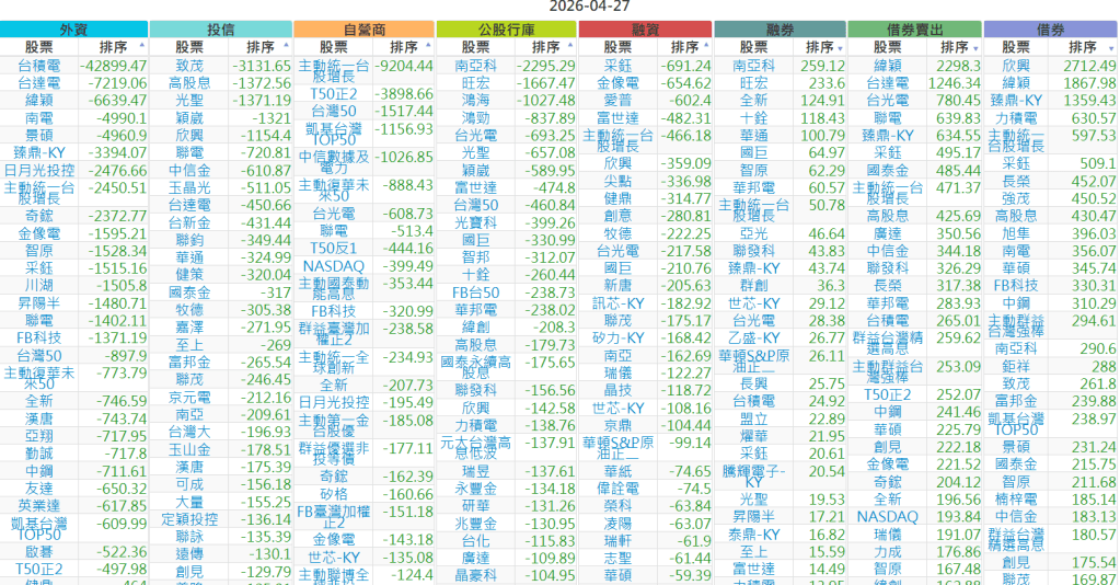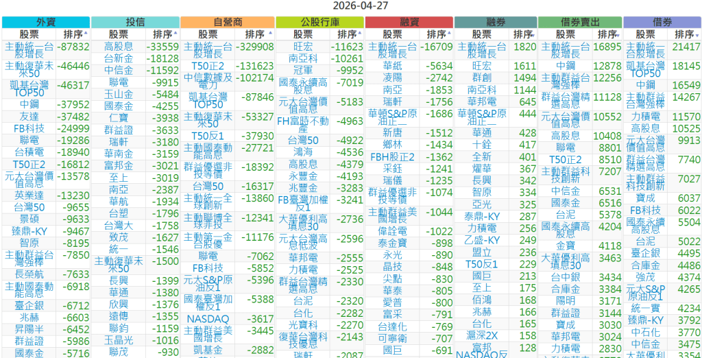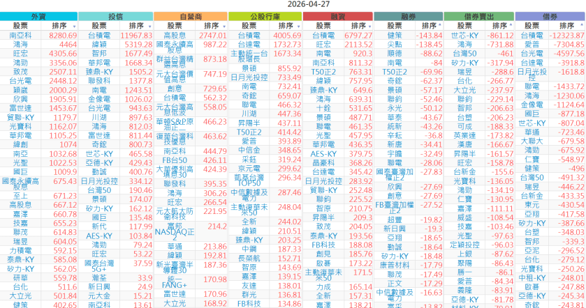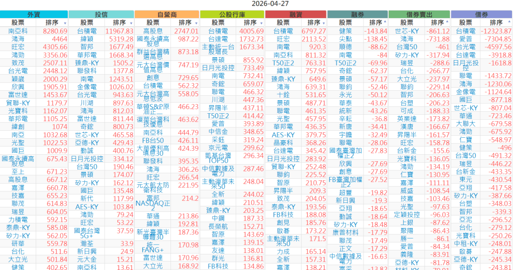 2026-0427【外資、投信】買賣超個股 2026-04-27 股狗網小編 投資誌-大盤 發表留言 上市:【外資、投信】買超(依金額) (單位:百萬) 上市:【外資、投信】賣超(依金額) (單位:百萬) 上市:【外資、投信】買超(依張數) (單位:張數) 上市:【外資、投信】賣超(依張數) (單位:張數) 免責宣言 本網站文章所提供資訊僅供參考,並無任何推介買賣之意,投資人應自行承擔交易風險。 分享此文: 分享到 X(在新視窗中開啟) X 分享到 Facebook(在新視窗中開啟) Facebook 喜歡 正在載入...