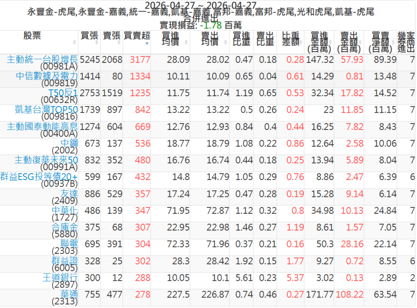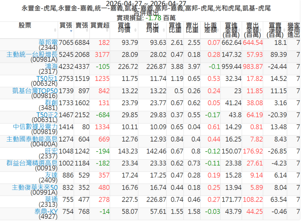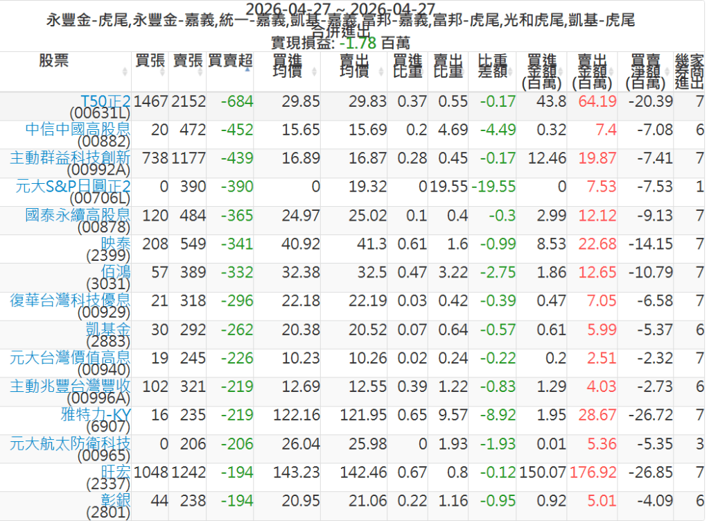 2026-0427主力買賣超個股 2026-04-27 股狗網小編 籌碼面每日資訊 發表留言 可參考下文 『如何查詢當沖、隔日沖分公司券商買賣』 主力當沖券商: 『元富虎尾』,『永豐金嘉義』,『統一嘉義』,『凱基嘉義』,『富邦嘉義』,『富邦虎尾』,『光和虎尾』,『凱基虎尾』,『永豐金虎尾』。 『當沖標的』 『買超股票』 『賣超股票』 免責宣言 本網站文章所提供資訊僅供參考,並無任何推介買賣之意,投資人應自行承擔交易風險。 分享此文: 分享到 X(在新視窗中開啟) X 分享到 Facebook(在新視窗中開啟) Facebook 喜歡 正在載入...