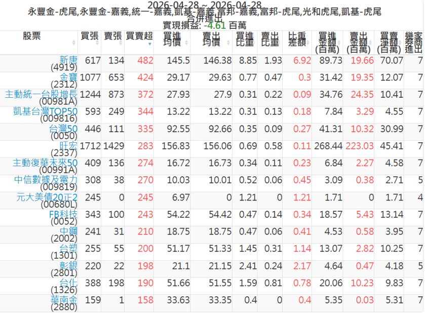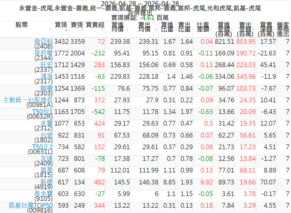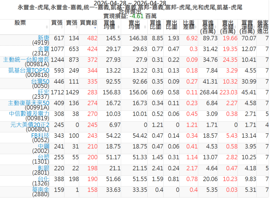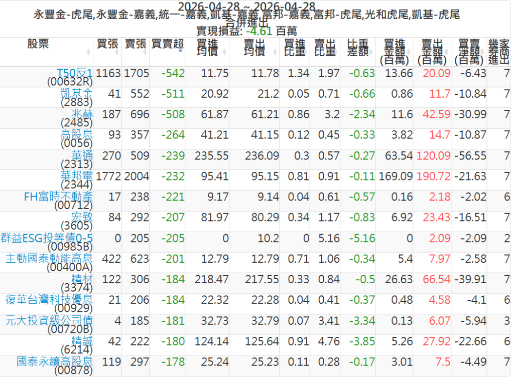 2026-0428主力買賣超個股 2026-04-28 股狗網小編 籌碼面每日資訊 發表留言 可參考下文 『如何查詢當沖、隔日沖分公司券商買賣』 主力當沖券商: 『元富虎尾』,『永豐金嘉義』,『統一嘉義』,『凱基嘉義』,『富邦嘉義』,『富邦虎尾』,『光和虎尾』,『凱基虎尾』,『永豐金虎尾』。 『當沖標的』 『買超股票』 『賣超股票』 免責宣言 本網站文章所提供資訊僅供參考,並無任何推介買賣之意,投資人應自行承擔交易風險。 分享此文: 分享到 X(在新視窗中開啟) X 分享到 Facebook(在新視窗中開啟) Facebook 喜歡 正在載入...