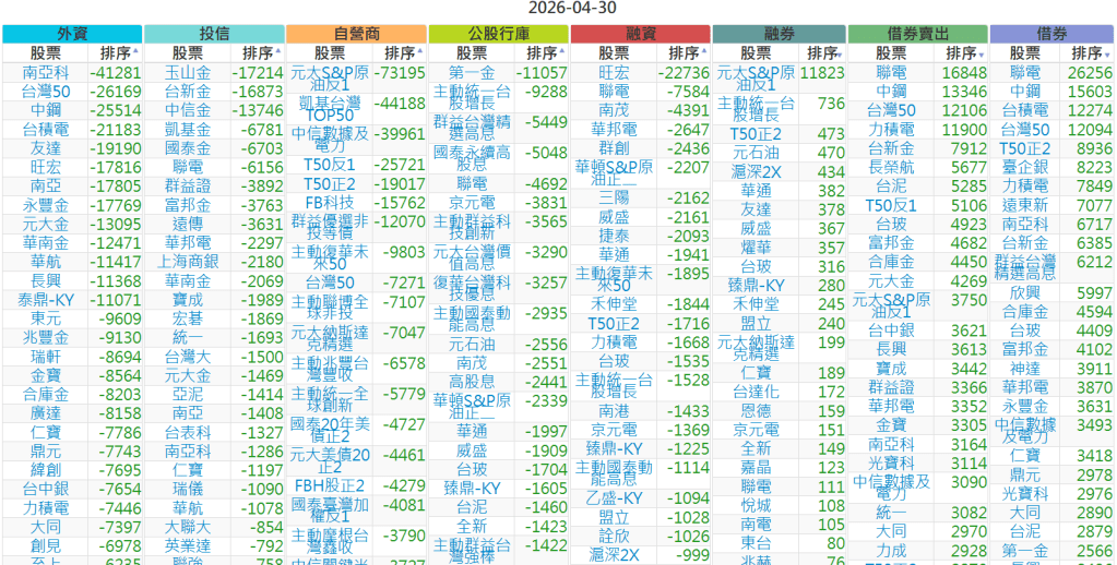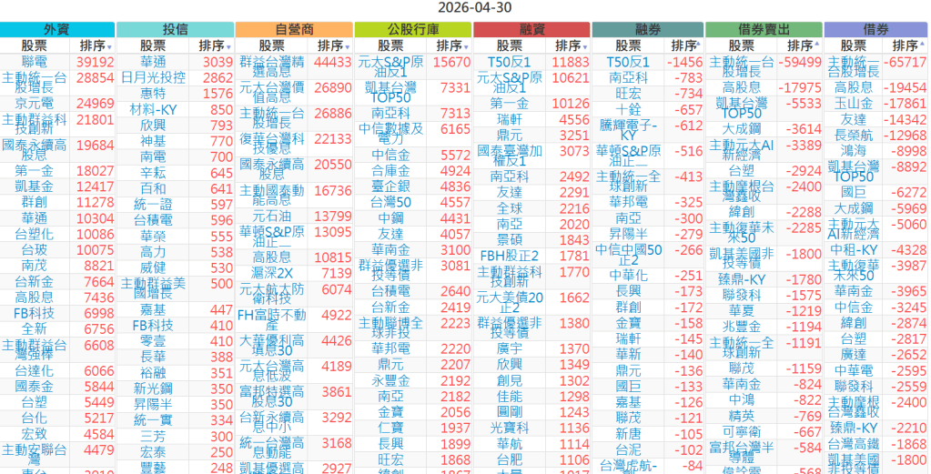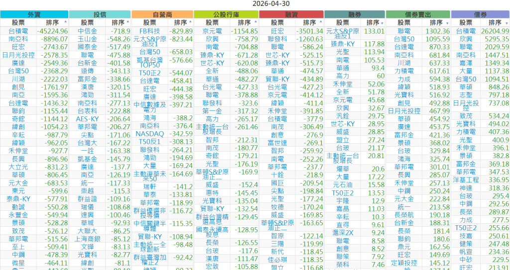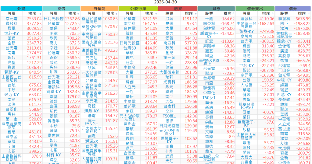 2026-0430【外資、投信】買賣超個股 2026-04-30 股狗網小編 投資誌-大盤 發表留言 上市:【外資、投信】買超(依金額) (單位:百萬) 上市:【外資、投信】賣超(依金額) (單位:百萬) 上市:【外資、投信】買超(依張數) (單位:張數) 上市:【外資、投信】賣超(依張數) (單位:張數) 免責宣言 本網站文章所提供資訊僅供參考,並無任何推介買賣之意,投資人應自行承擔交易風險。 分享此文: 分享到 X(在新視窗中開啟) X 分享到 Facebook(在新視窗中開啟) Facebook 喜歡 正在載入...