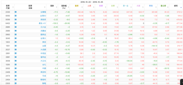 20181025今日買賣超排行 單位:百萬元