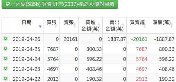 20190426認購(售)權證標的買賣超排行(旺宏現貨與權證多空價差套利交易)